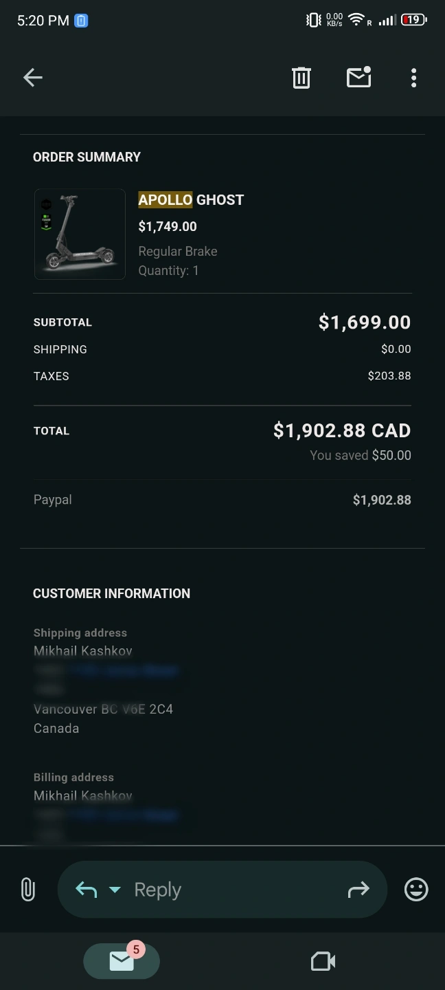 I'm selling my Apollo Ghost electric scooter, bought new in March 2023 from Apollo Scooters (Canadian company). I’m the original and only owner.
