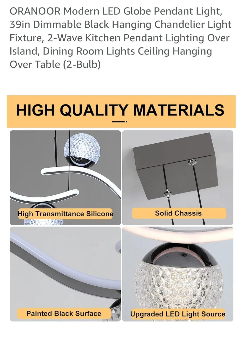 39in Dimmable black hanging chandelier. Two-wave design. Kitchen island or dining room lighting. Ceiling hanging light over table. Includes remote control. Two bulbs. Brand new - open box.