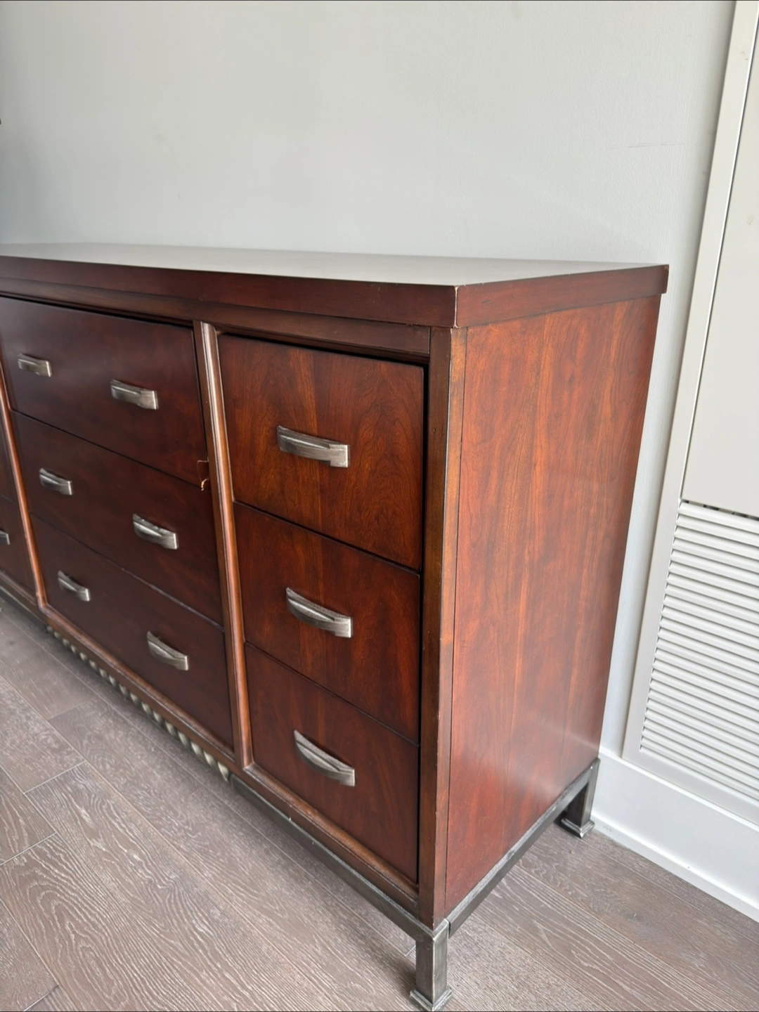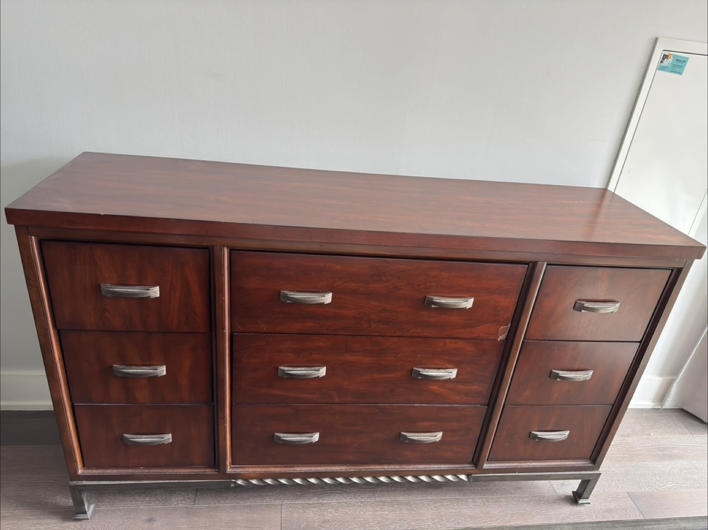 Large dresser, eight drawers. Dark brown wood finish. Minor cosmetic damage to top. Metal drawer pulls. Features decorative detailing along the base.