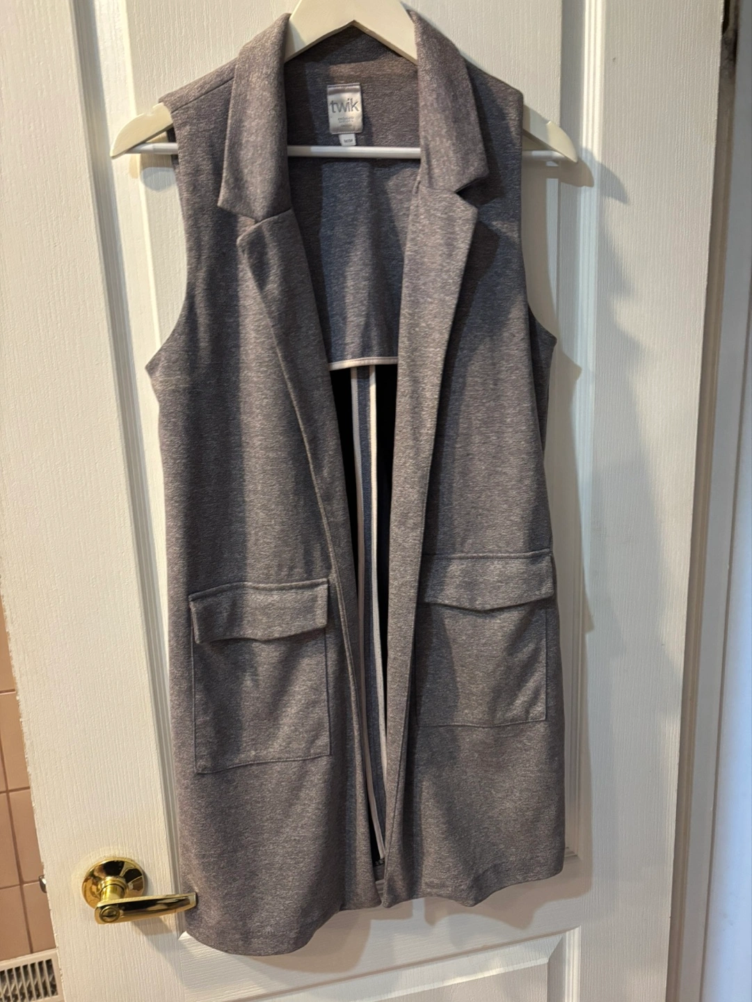 Long sleeveless vest. Grey marl fabric. Two pockets. Open front. Size Medium. CASH ONLY