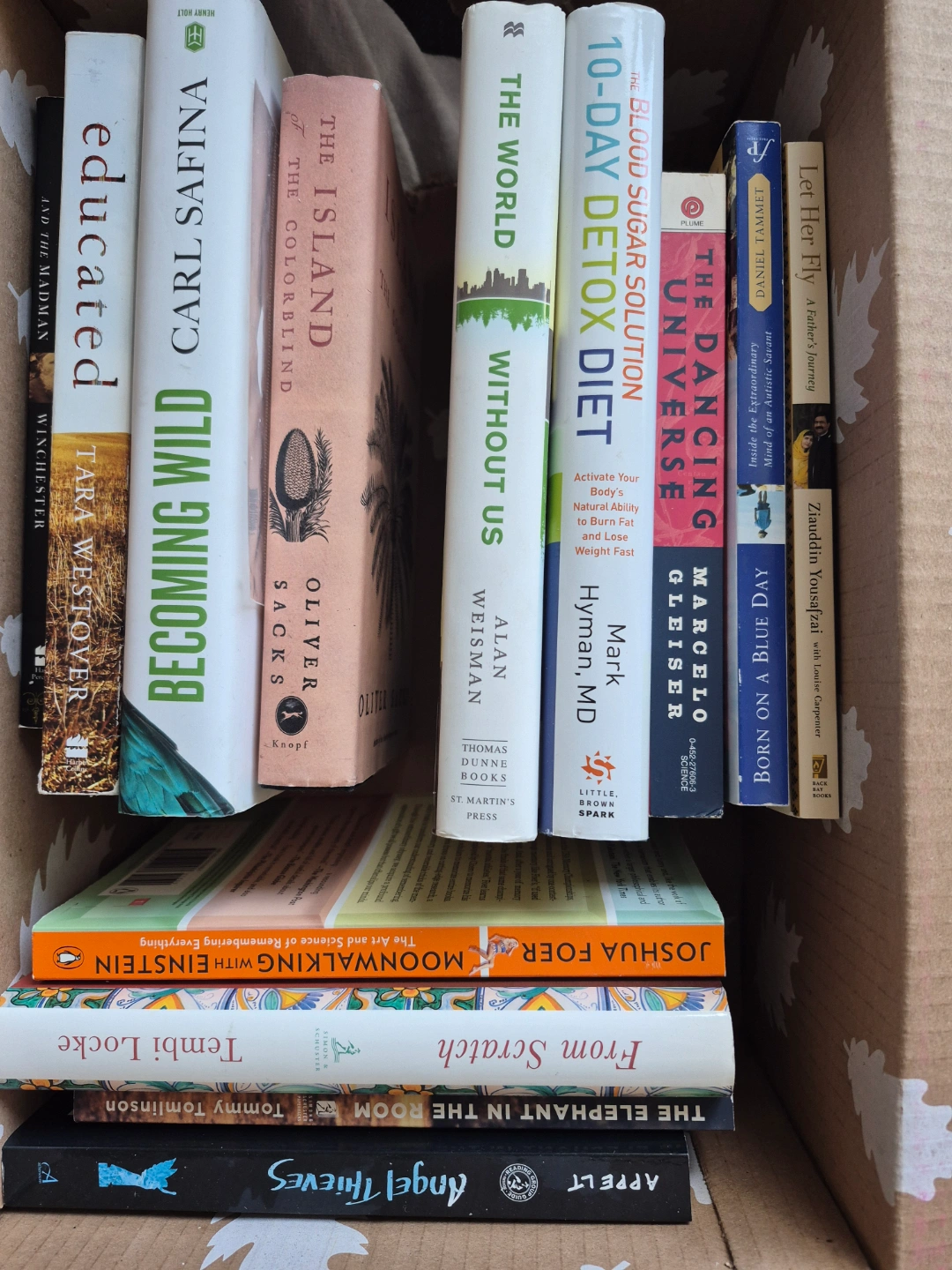 Assortment of pre-owned books. Various authors and genres included. Titles include *Educated*, *Becoming Wild*, *The Island of the Colorblind*, *The World Without Us*, *The Blood Sugar Solution*, *The Dancing Universe*, *Born on a Blue Day*, *Angel Thieves*, *The Elephant in the Room*, *From Scratch*, and *Moonwalking with Einstein*.