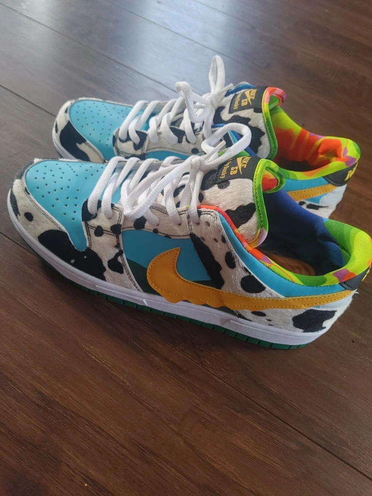 Pair of Nike SB Dunk Low Chunky Dunky sneakers. Cow print design. Multiple colours. Includes extra laces.