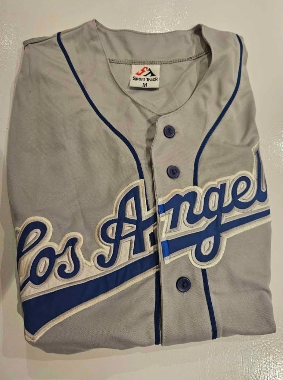 97Grey Los Angeles Angels baseball jersey. Features blue and white embroidered lettering. Size medium. Button-up front.