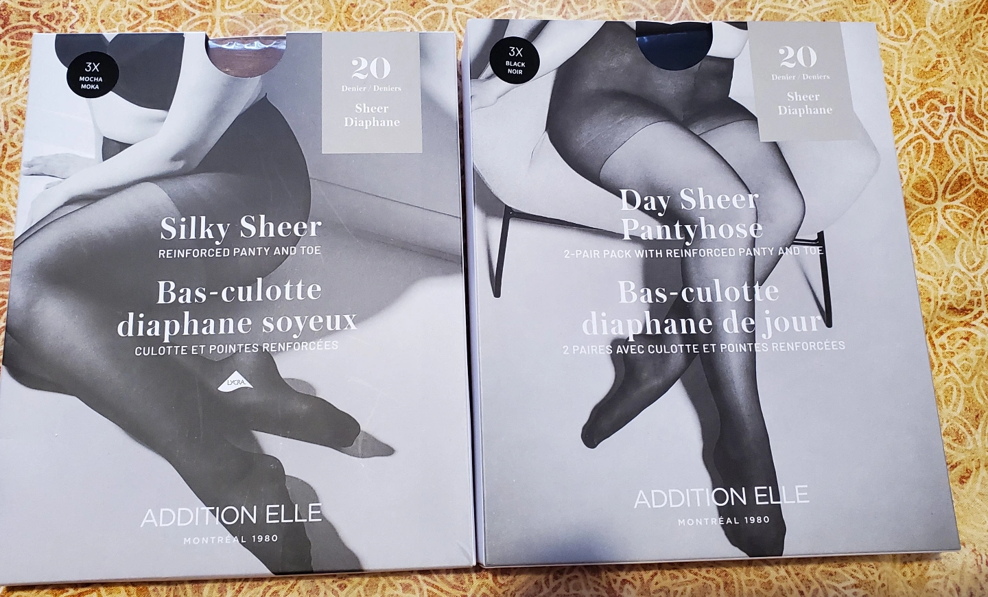 New Addition Elle pantyhose. Three pairs included, 2 pairs of black 1 mocha Size 3X. 20 denier sheer. Reinforced panty and toe. Black and Mocha colours. SFPF HOME Looking for fastest pick up. Delivery not available. Brimley & Eglinton for pick up. No returns.