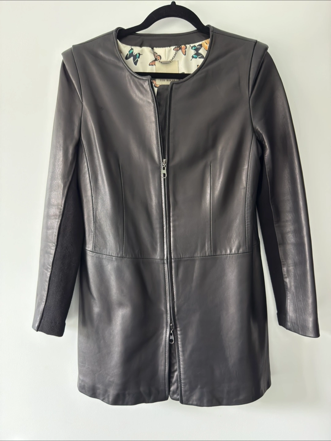 Gorgeous Ted Baker leather jacket. Black leather exterior, butterfly print lining. Three quarter sleeves. Zip front closure. Excellent condition.
