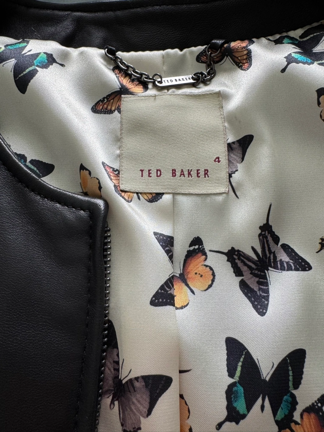 This is a used Ted Baker black leather jacket in size 4, which is equivalent to a US size small. It has a front zipper and a butterfly-print lining.