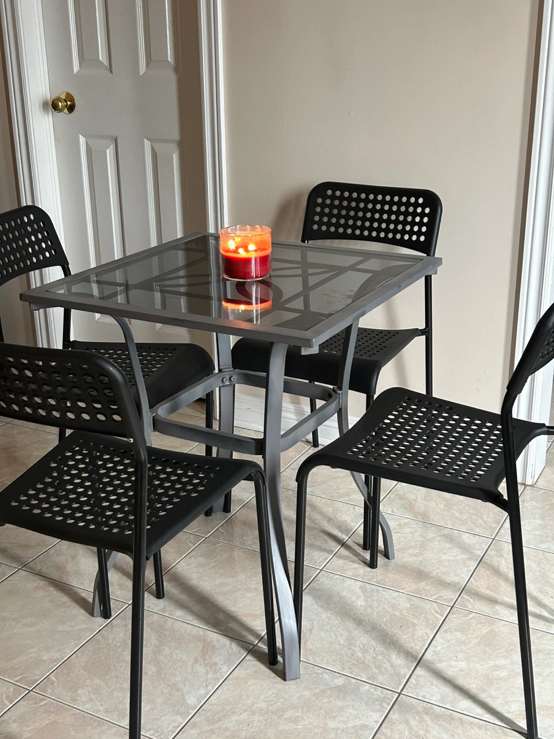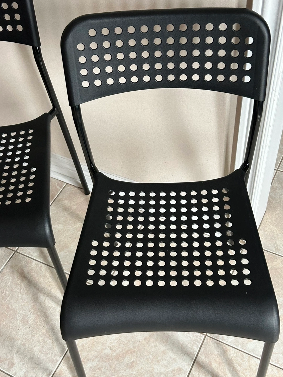 Set includes four black plastic chairs . Great for small spaces. Minimalist design. Good condition.