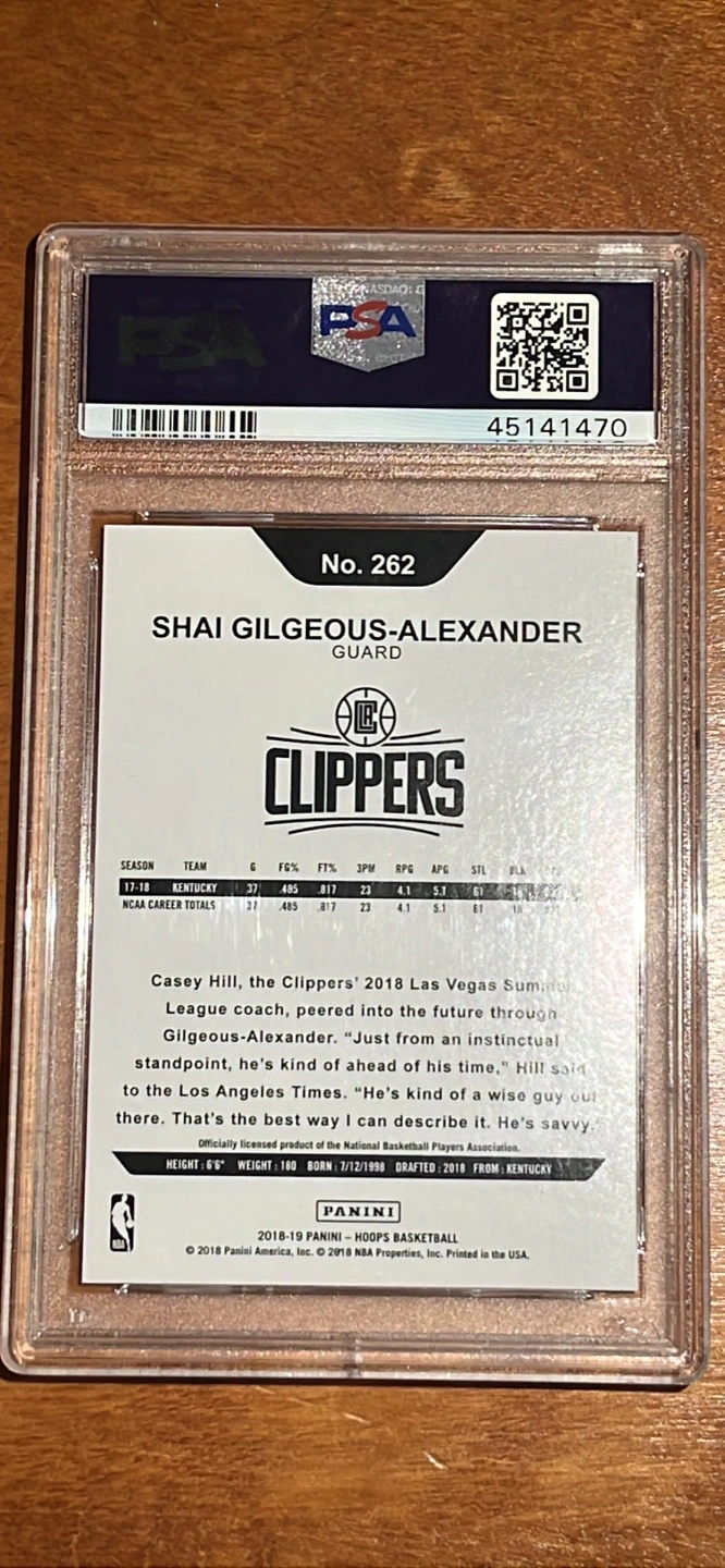 Graded PSA 10 Gem Mint. 2018 Panini Hoops basketball card. Shai Gilgeous-Alexander rookie card. Numbered #262. Los Angeles Clippers.