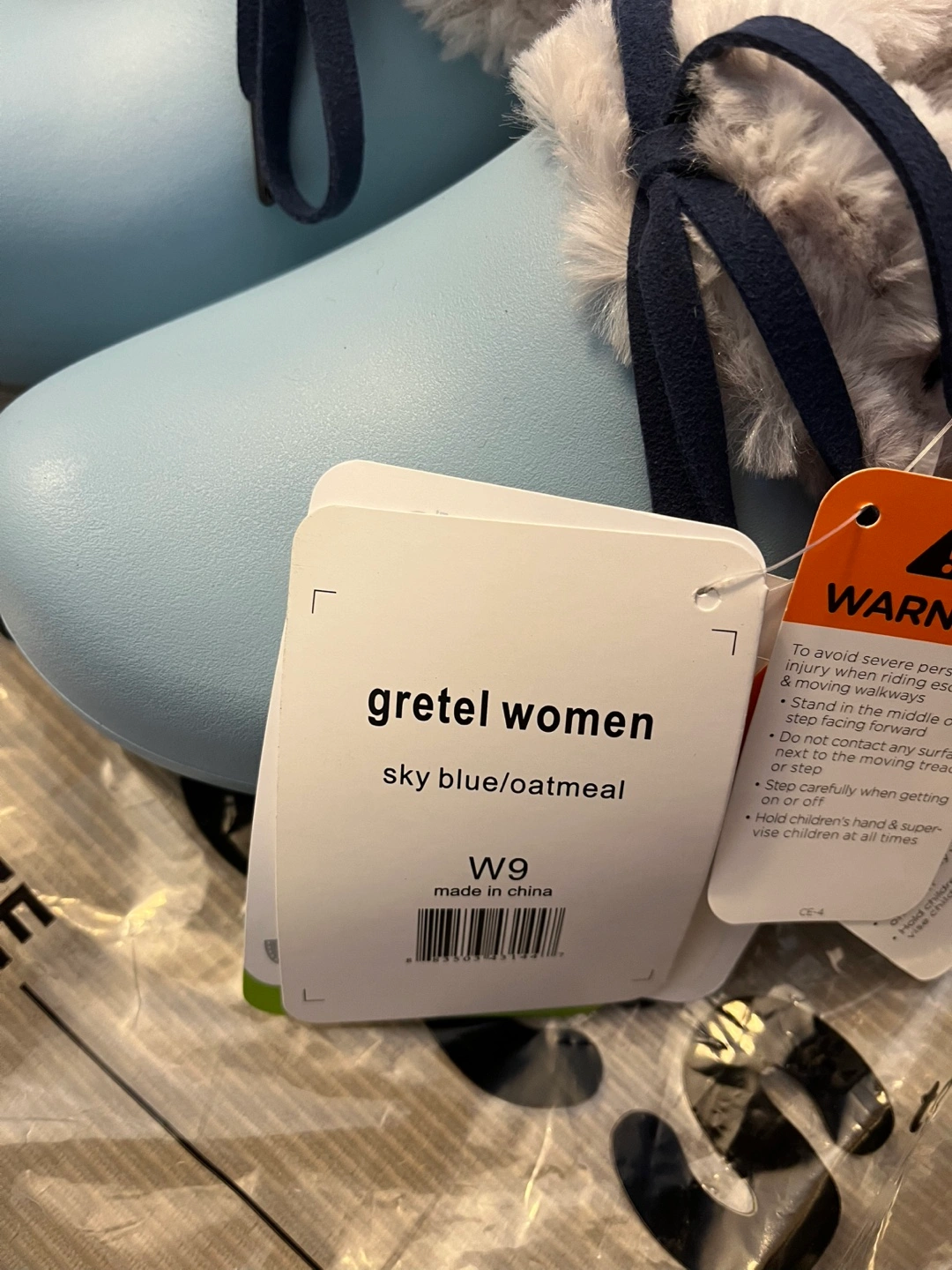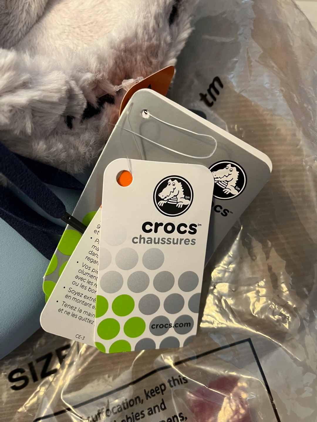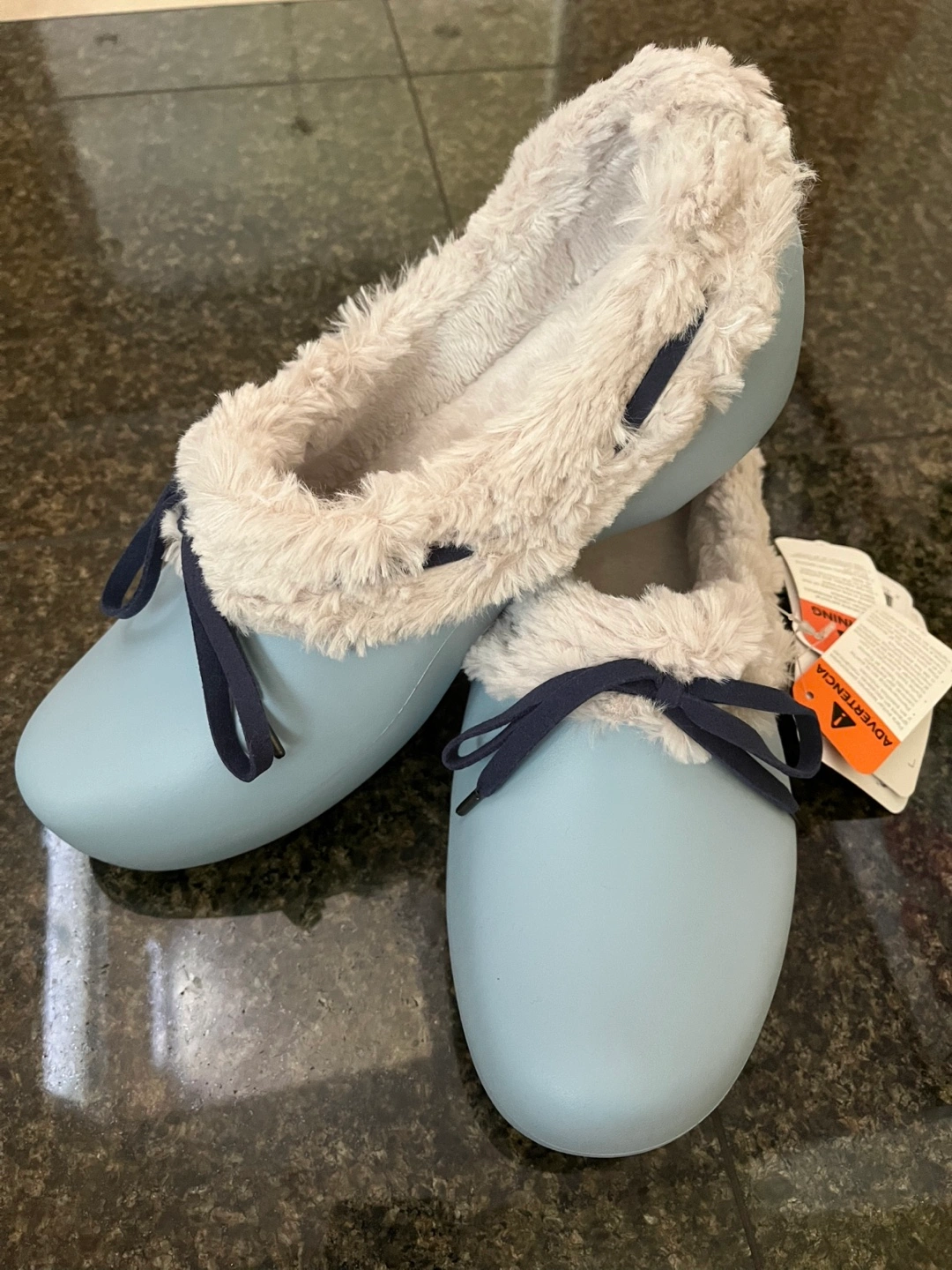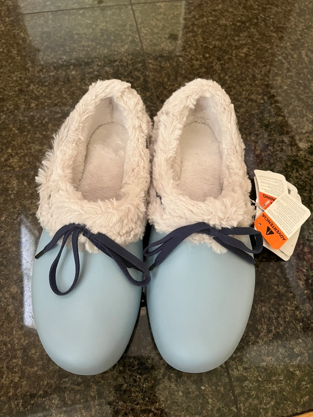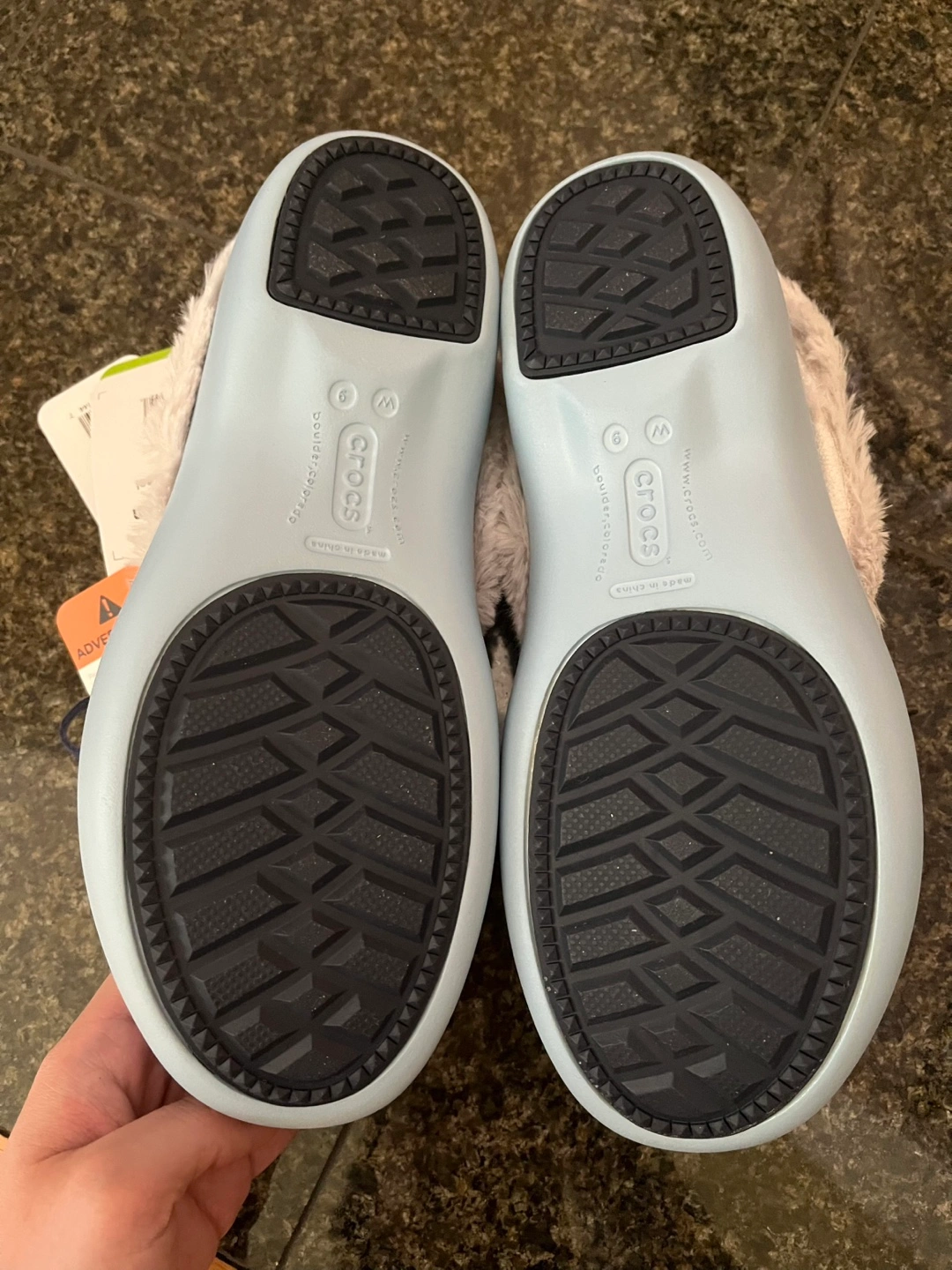 Women's Crocs Gretel clogs. Sky blue/oatmeal colourway. Size W9. Fuzzy lining. Navy blue ribbon accents. Brand New with tags.