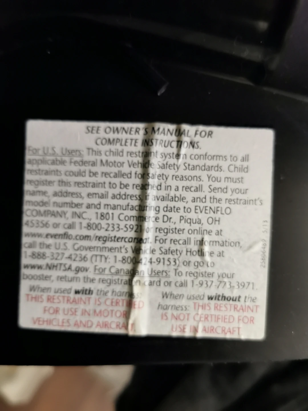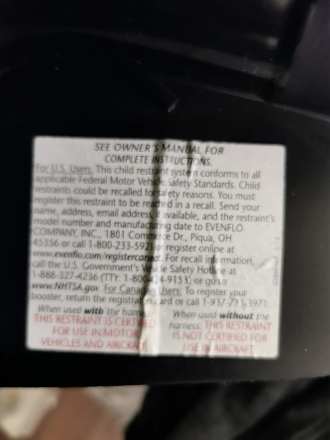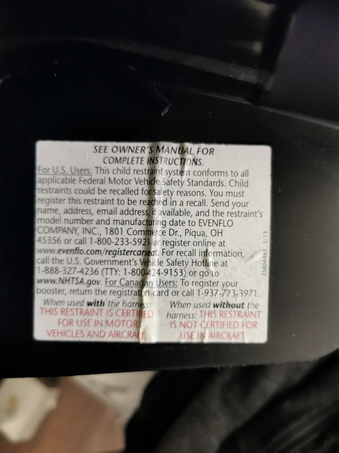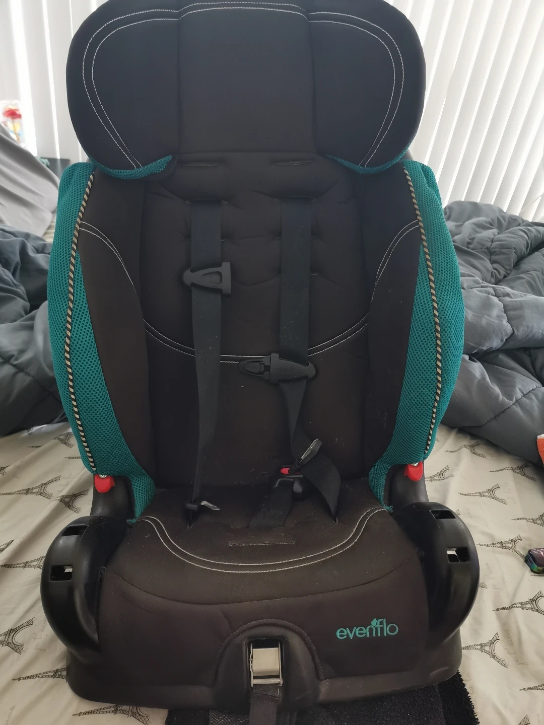 Used Evenflo child car booster seat. Teal and black colour scheme. Features a five-point harness. See owner's manual for complete instructions. Suitable for children meeting specified weight and height requirements. Check all safety features before use.