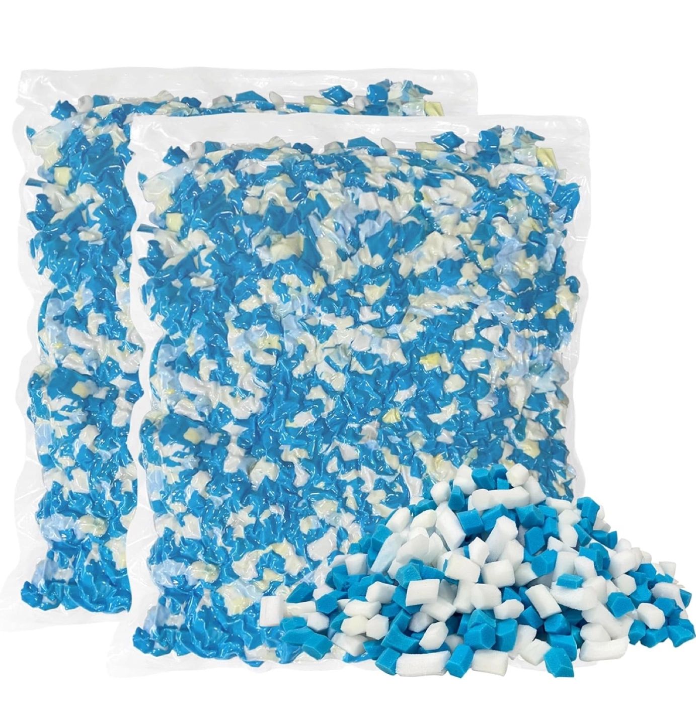 Four vacuum-sealed bags of colourful shredded memory foam -20lb in total . Perfect for refilling cushions or creating custom seating. Blue, white, and red colour variations. Excellent for crafting projects.