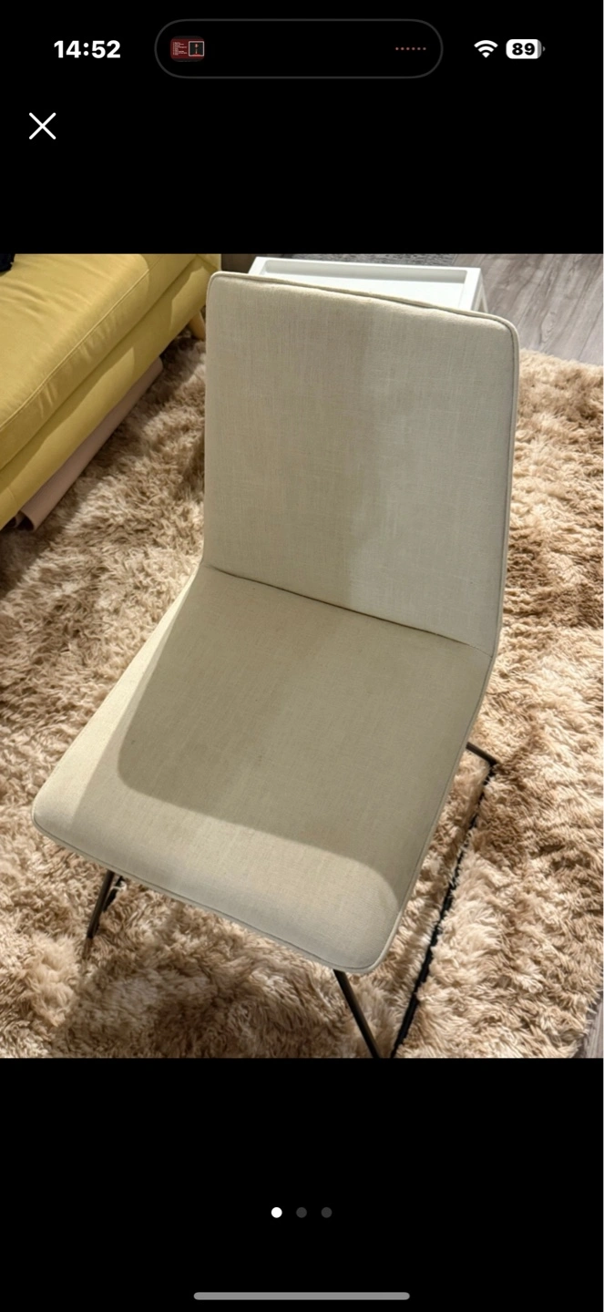 Stylish and comfortable dining chair. Off-white fabric seat and back. Sleek black metal frame. Perfect for a contemporary space.