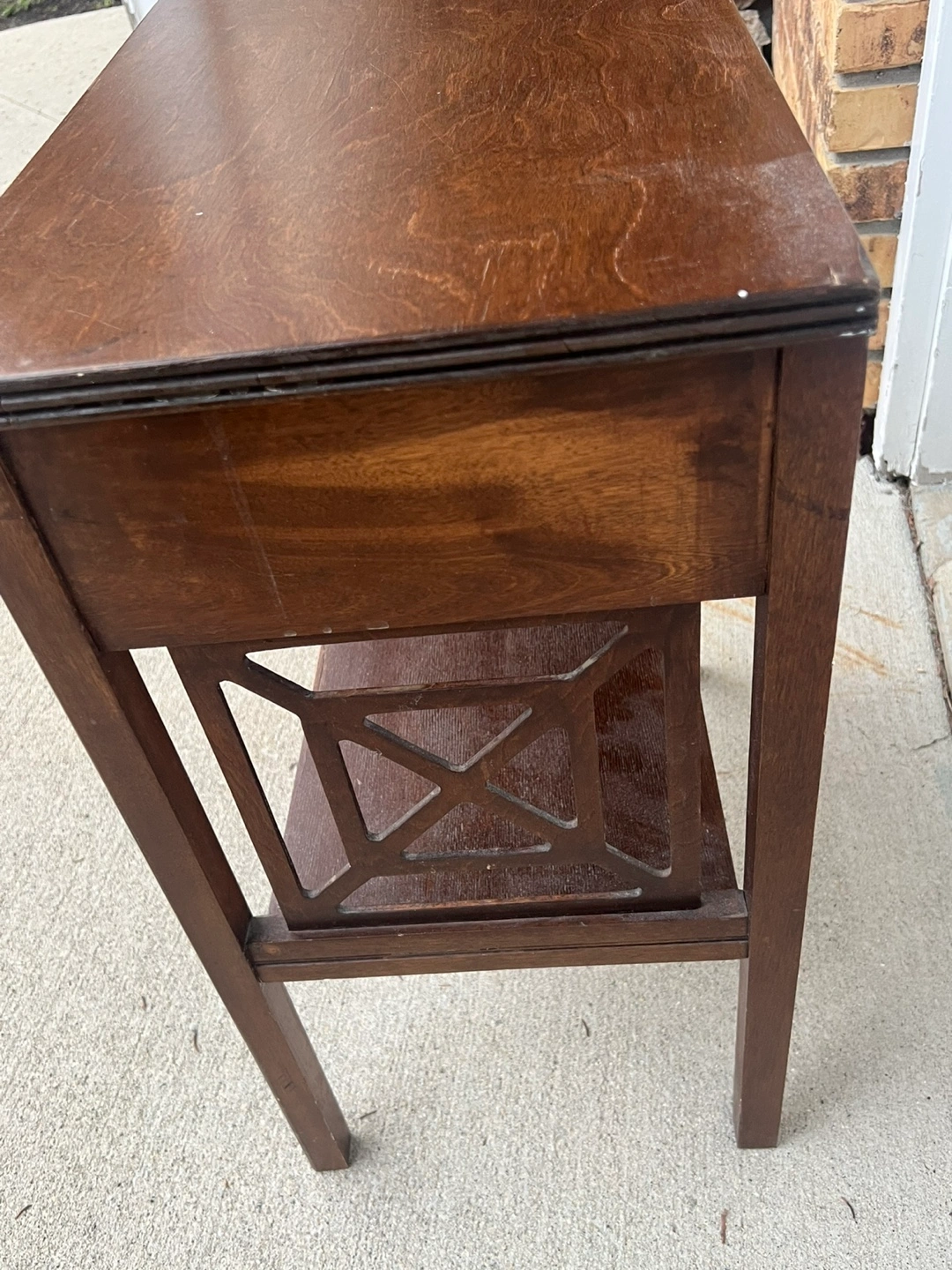 Dark brown wooden end table. Features one drawer and a lower shelf with an interesting geometric cutout design. Simple, classic style. Would look great in a bedroom or living room.