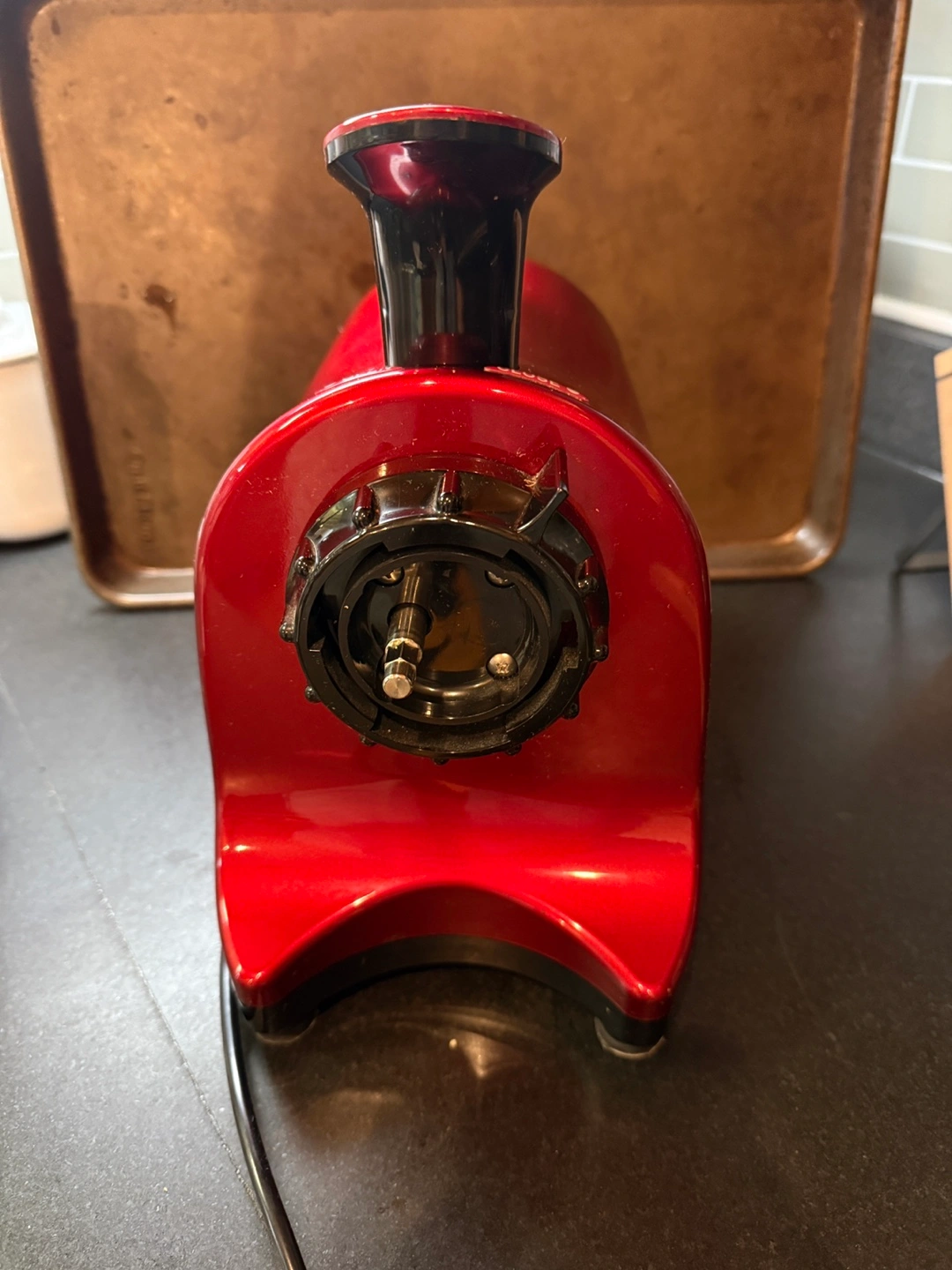 Red Omega juicer. Includes 6 glass bottles and 2 new mesh filters. Good condition. Used, but clean.