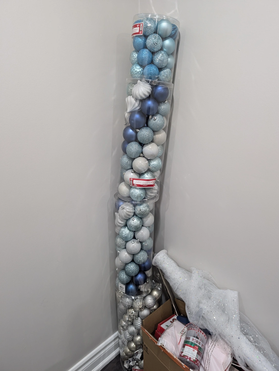 Three containers of various sized Christmas ornaments. Shades of blue, silver, and white. Many different textures and styles.