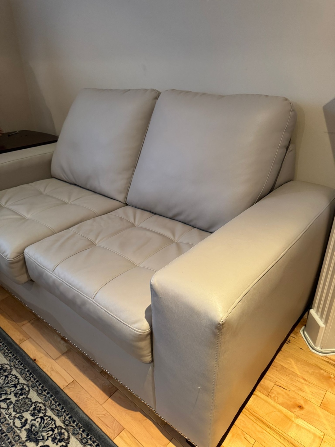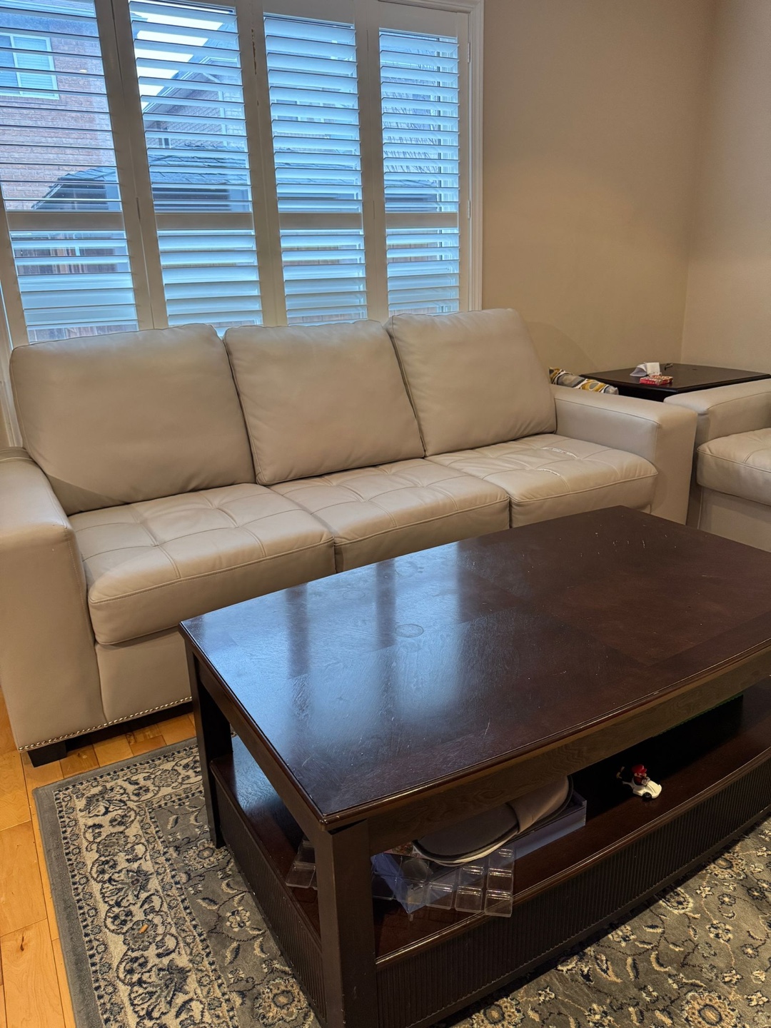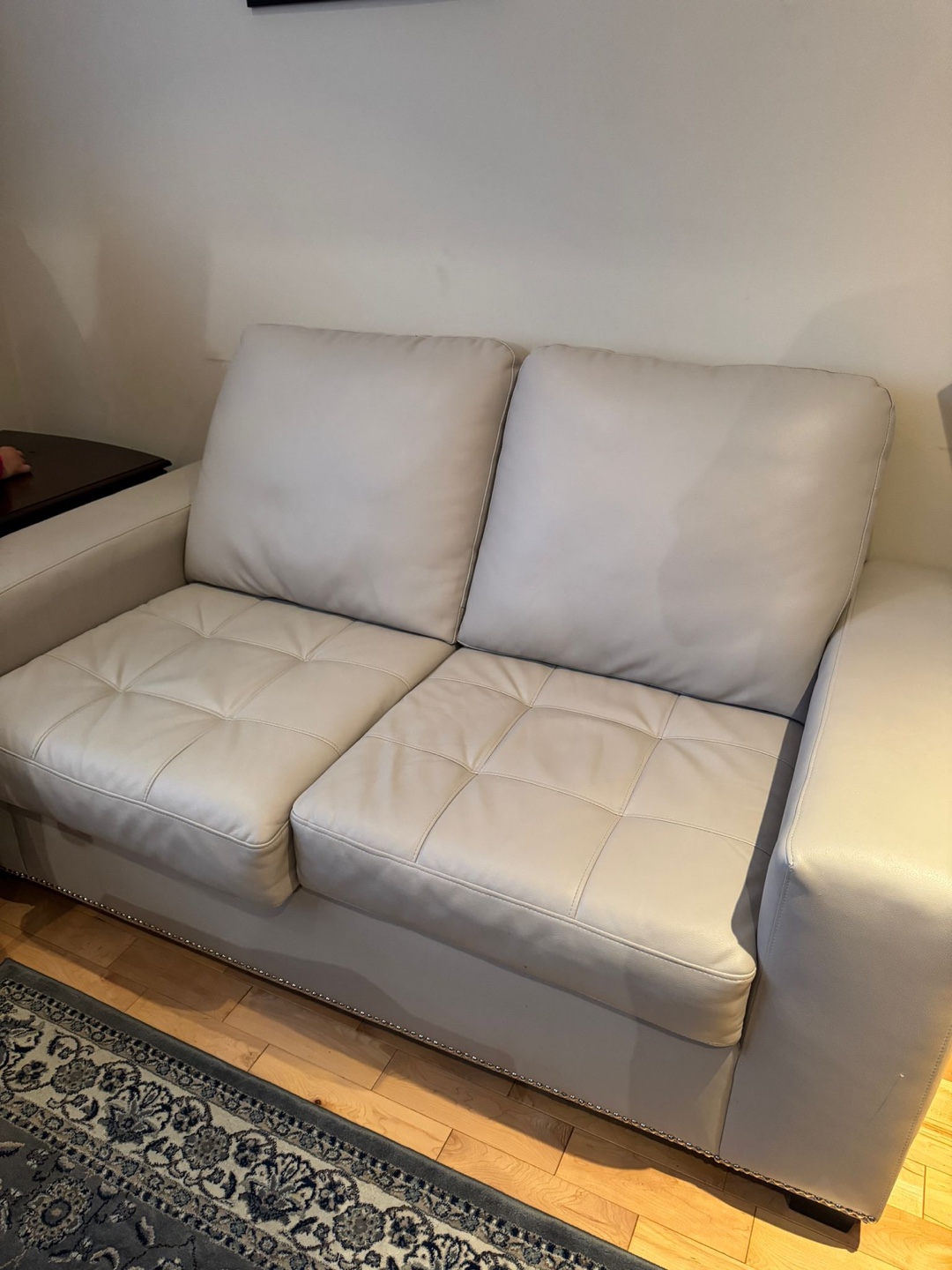 Comfortable and stylish beige leather sofa and loveseat. Three-seater sofa and two-seater loveseat. Button-tufted design. Good condition. Minor wear. Moving Sale
