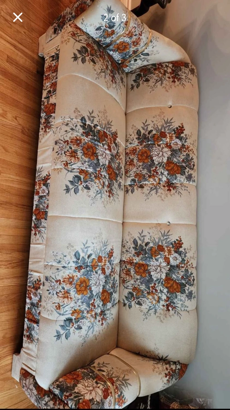 Beautiful vintage sofa. Floral print upholstery. Cream, orange, and blue tones. Classic design. Three-seater sofa & love seat