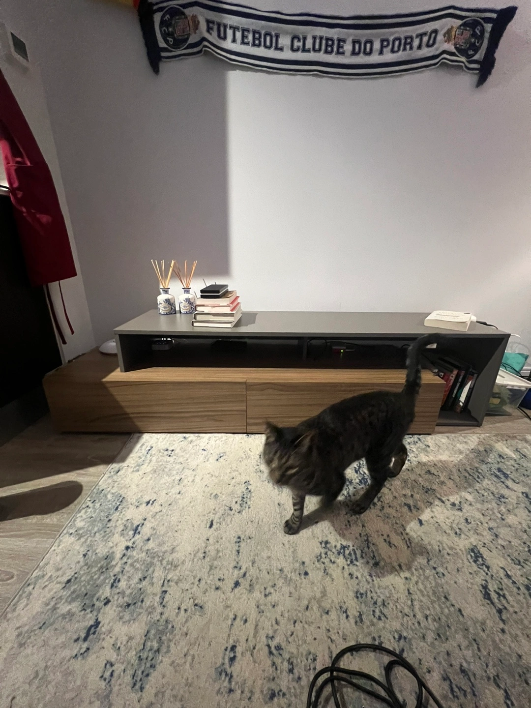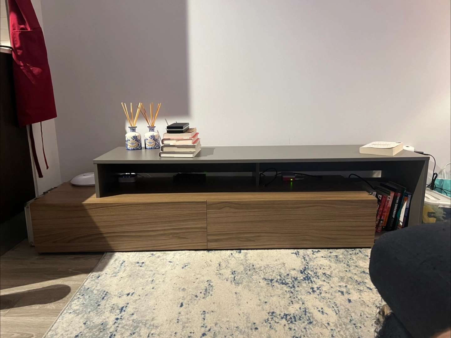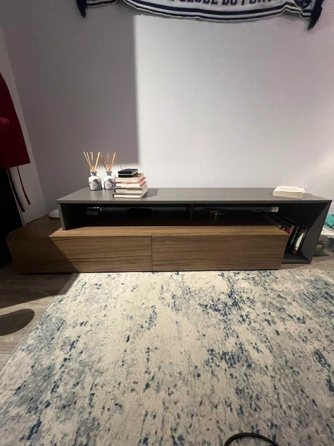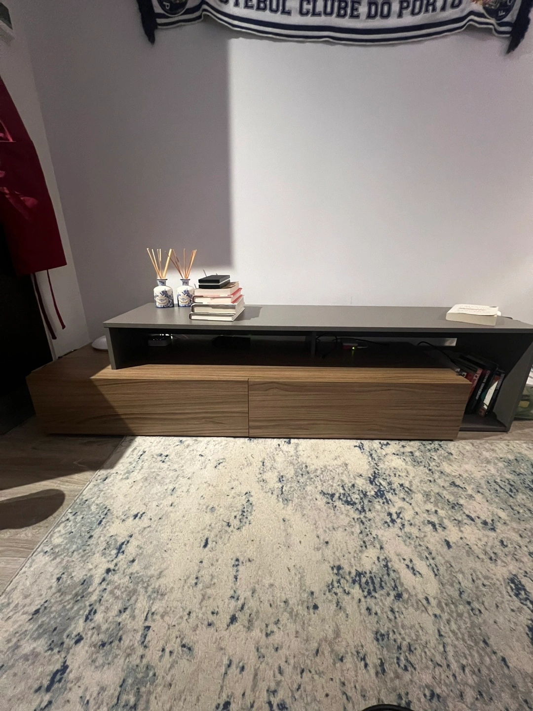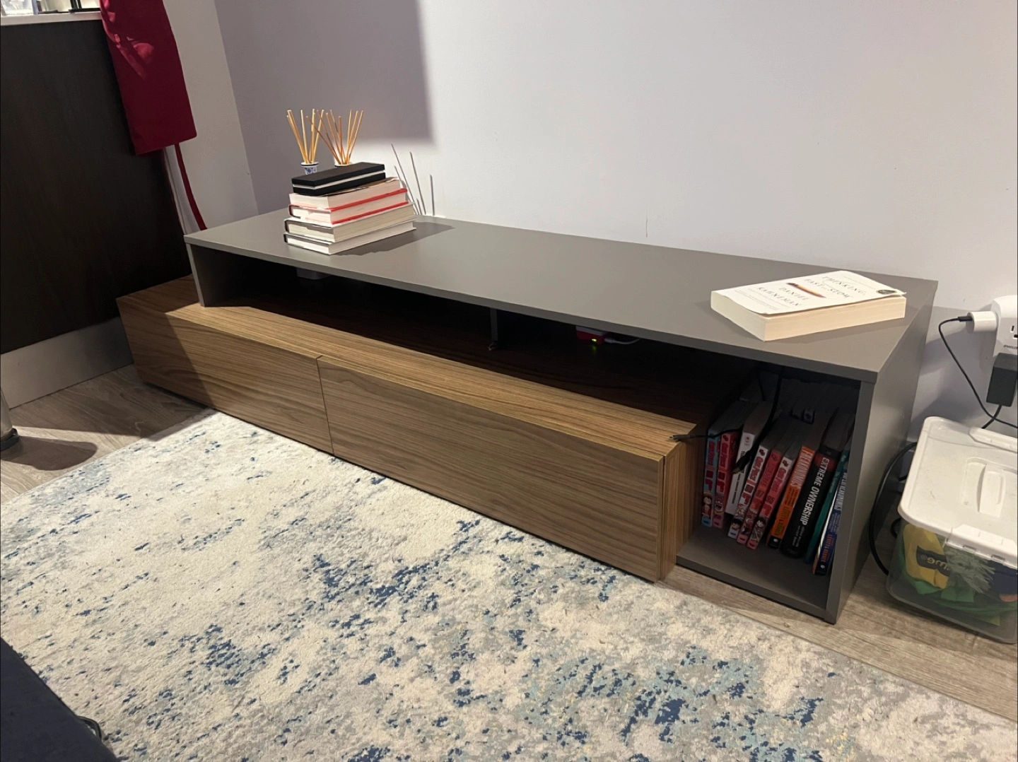 It costs $385 + tax on Wayfair. Contemporary TV stand. Two drawers and open shelving. Grey top and nutmeg-toned base. Like new. Weights around 88lbs.