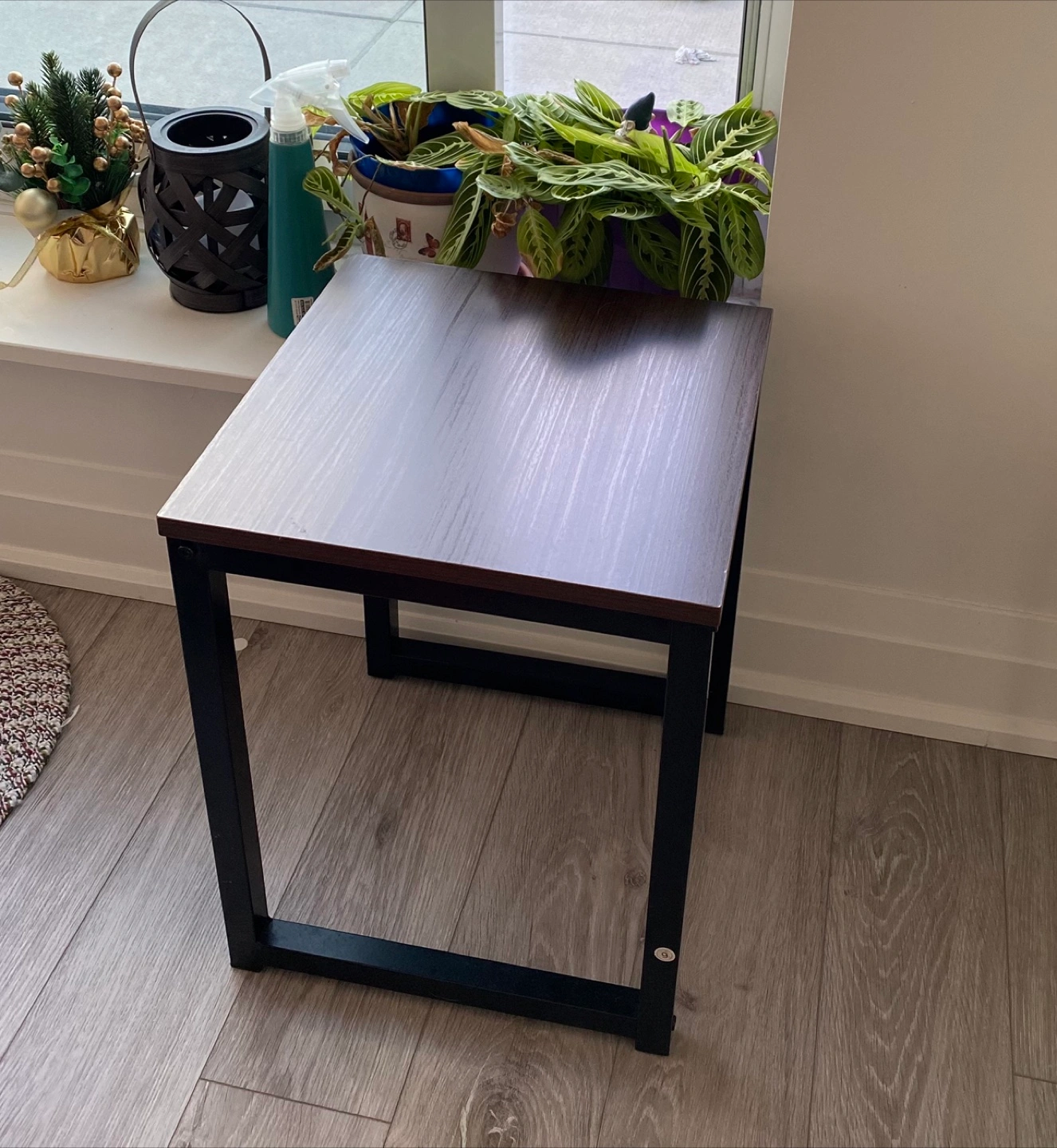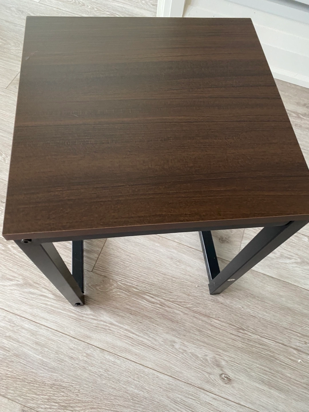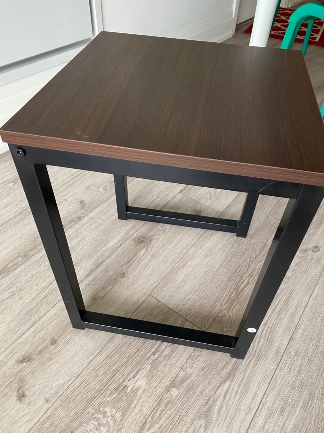 Small square bench. Dark brown woodgrain top. Black metal frame. Simple design. Good for small spaces.