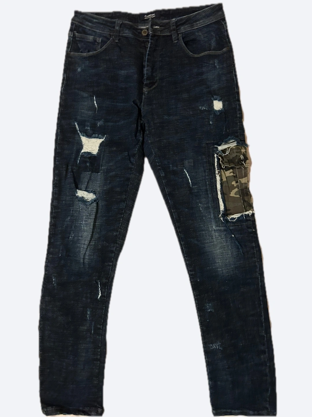 Dark wash denim jeans. Multiple distressed areas. Features a camouflage fabric patch on the right leg. Slim fit.