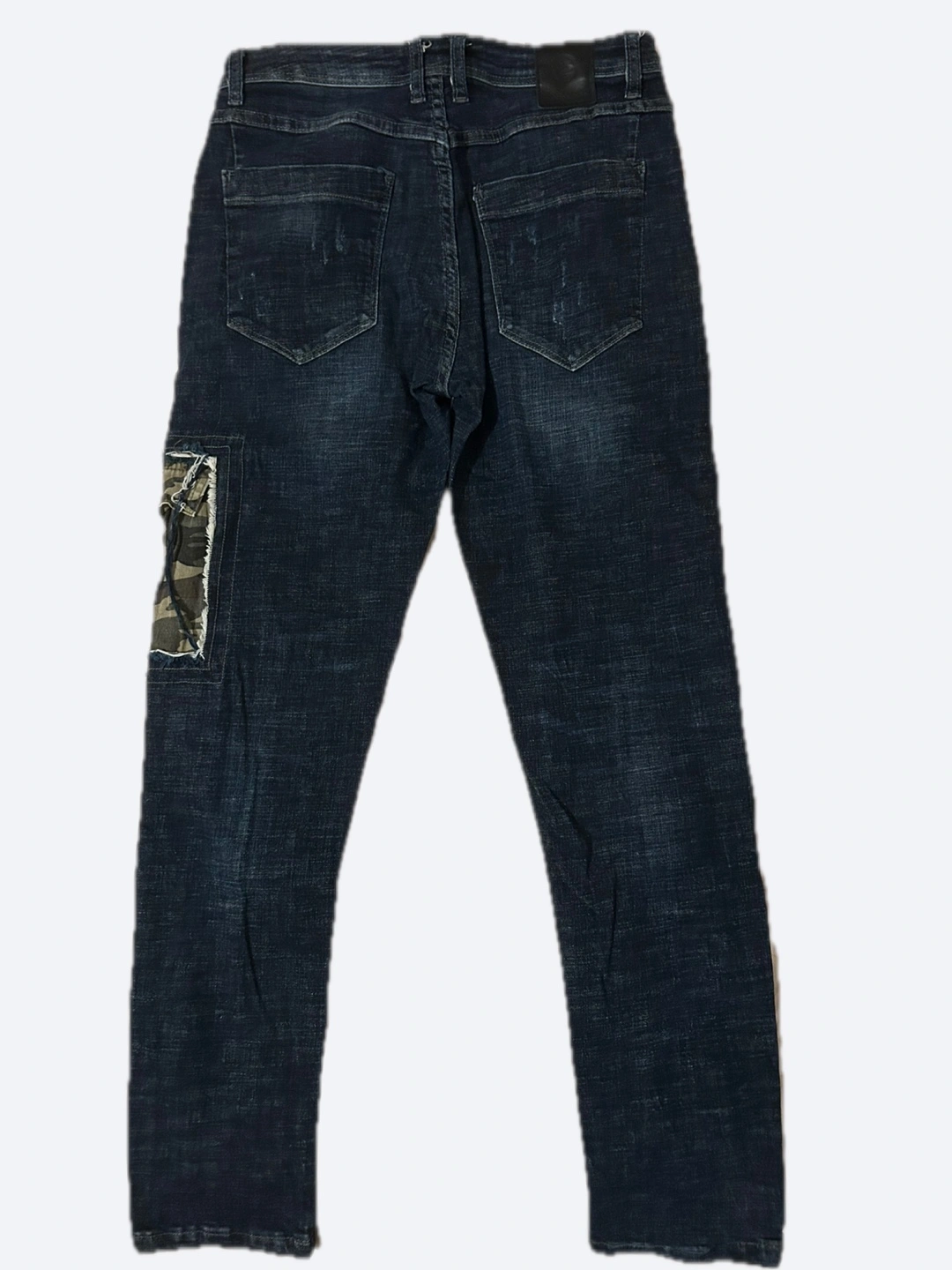 Dark wash denim jeans. Multiple distressed areas. Features a camouflage fabric patch on the right leg. Slim fit.