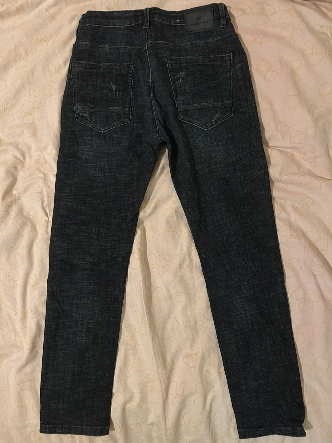 Dark wash denim jeans. Distressed detailing throughout. Slim fit.