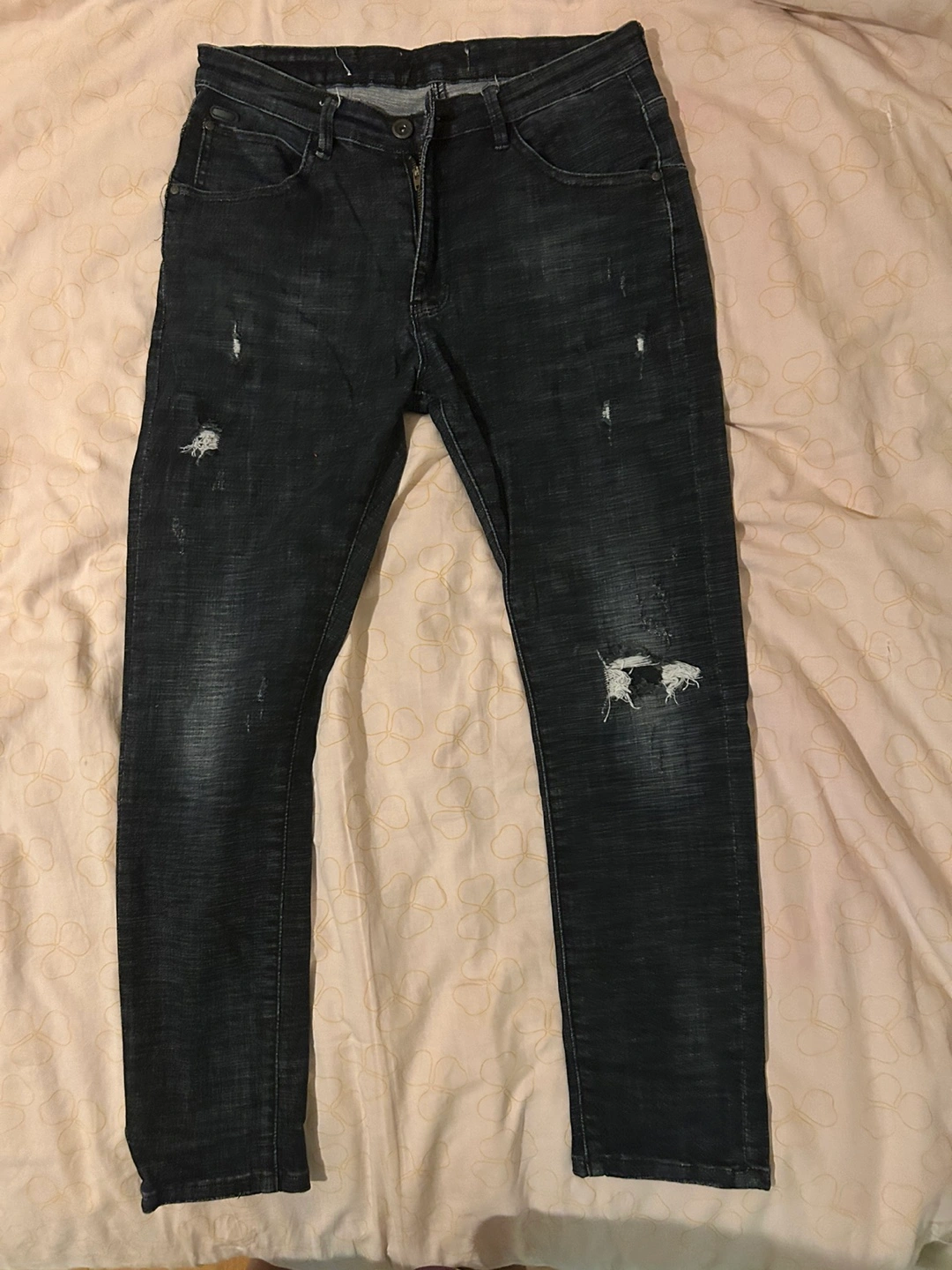 Dark wash denim jeans. Distressed detailing throughout. Slim fit.
