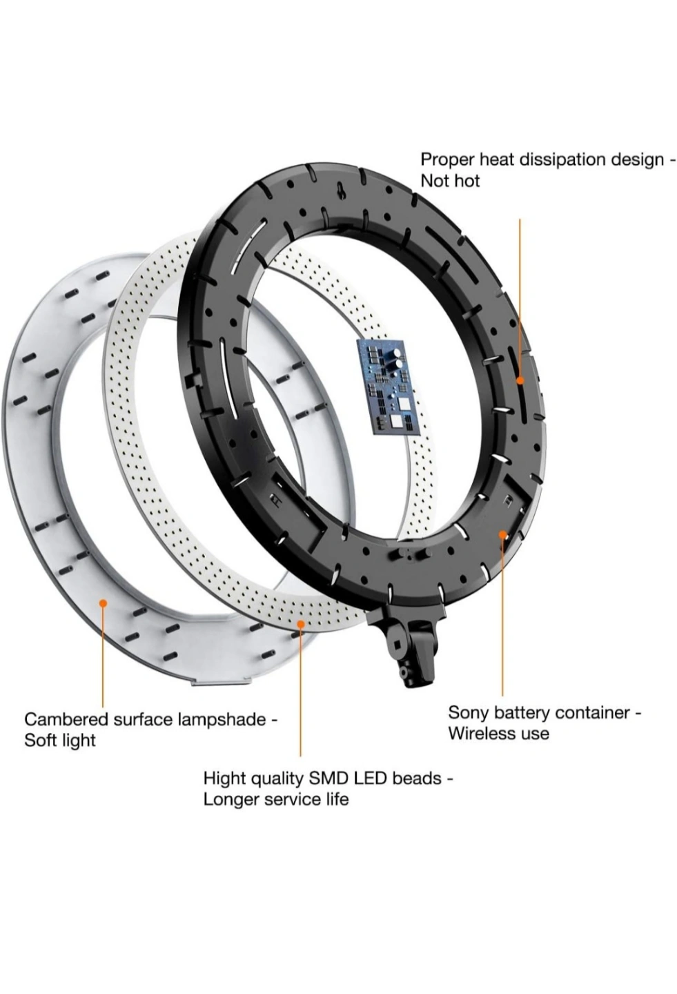 18-inch ring light, 60W. Adjustable stand, phone holder, remote control. Dimmable, color temperature adjustable. Wireless use with Sony batteries. Includes carrying case