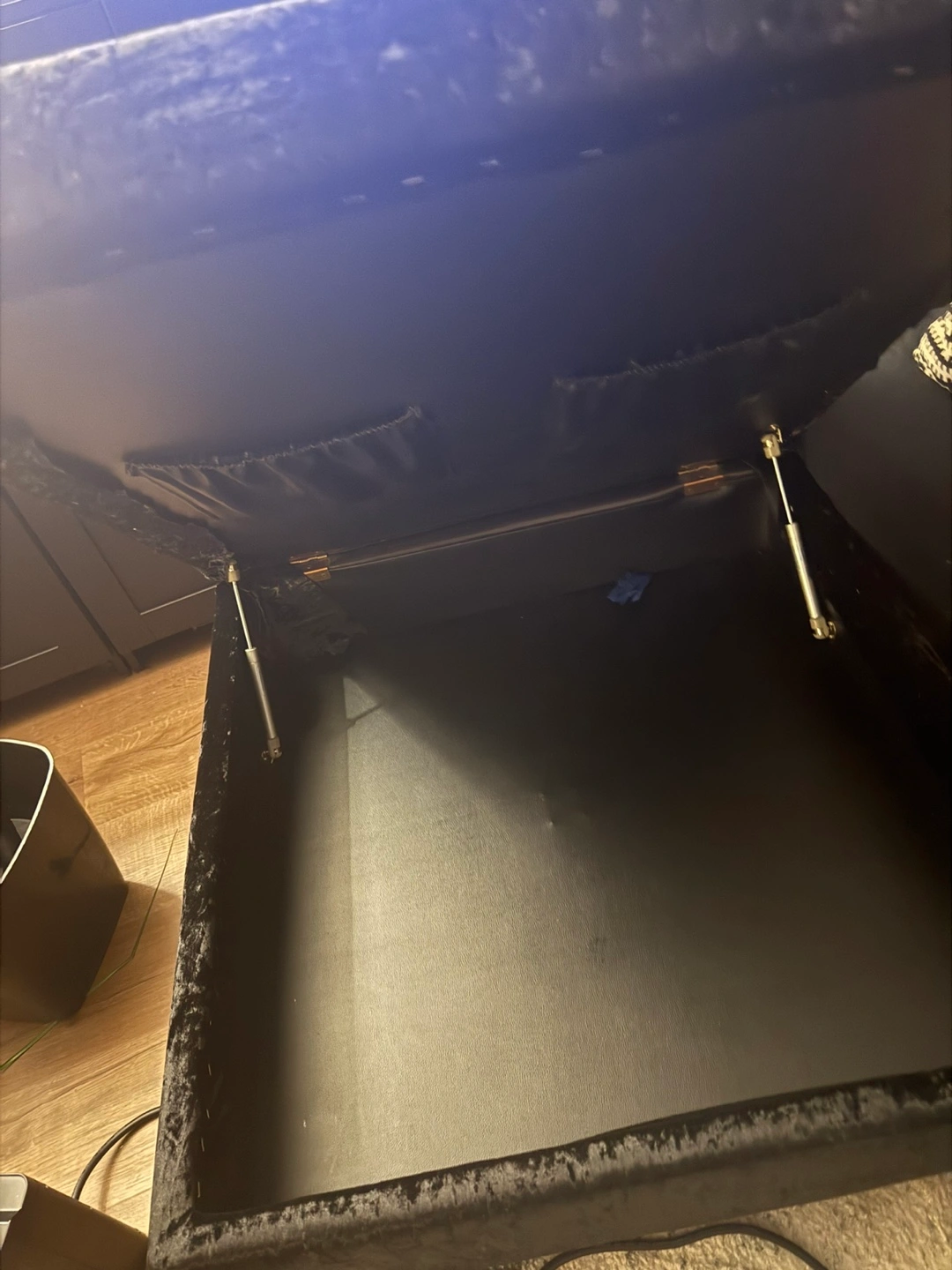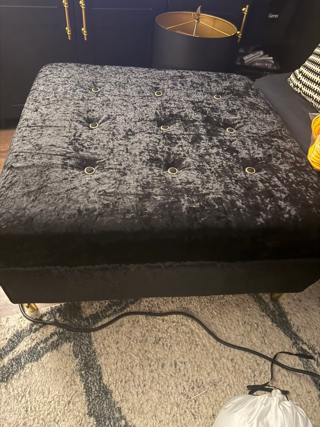 Stylish black velvet ottoman. Features gold legs and button tufting. Offers storage space inside. Great accent piece for living room or bedroom.