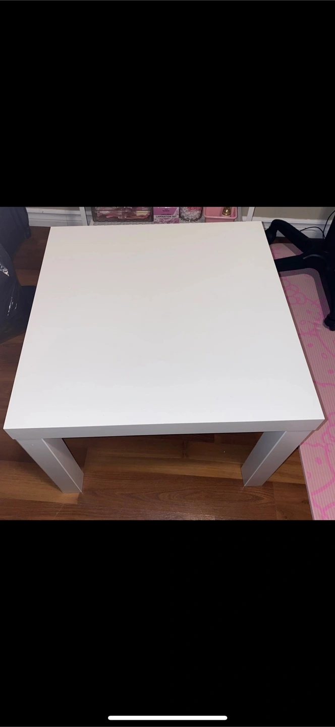Simple white coffee table. Square top. Four legs. Minimalist design. Good condition.