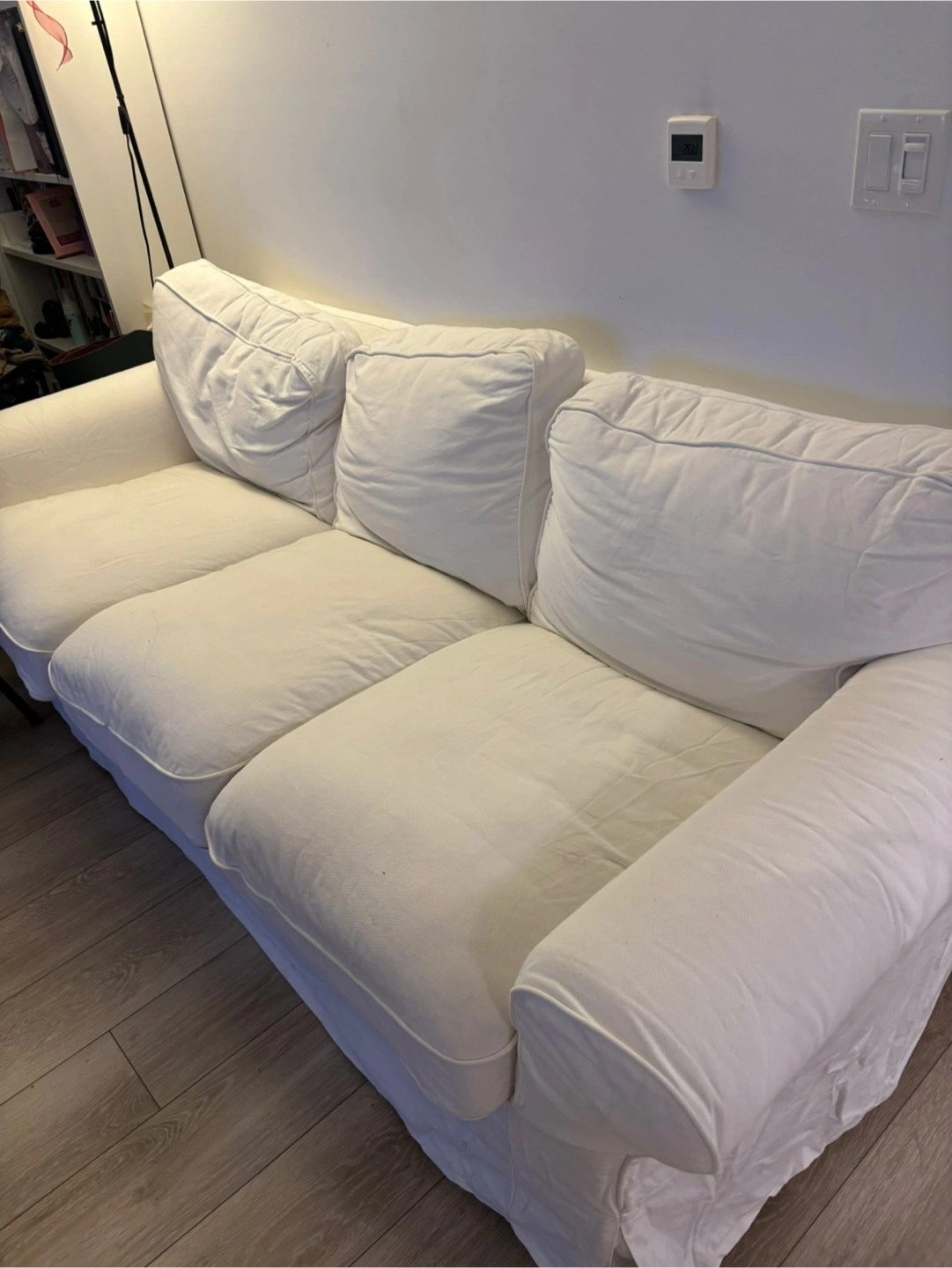 Three-seater sofa. White slipcover. Good condition. Some minor wear. Measurements available upon request.