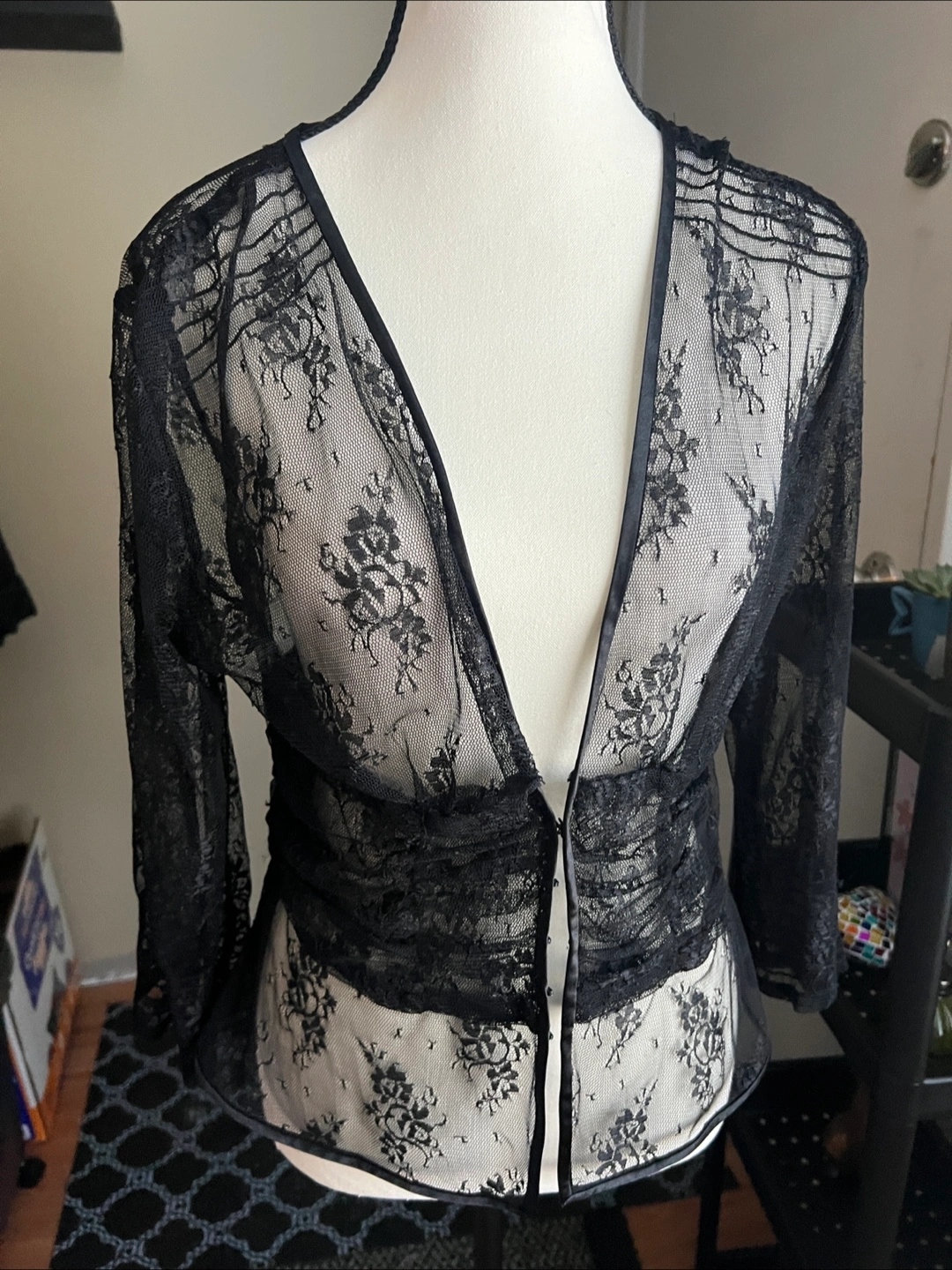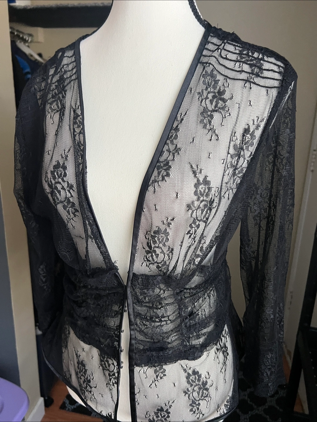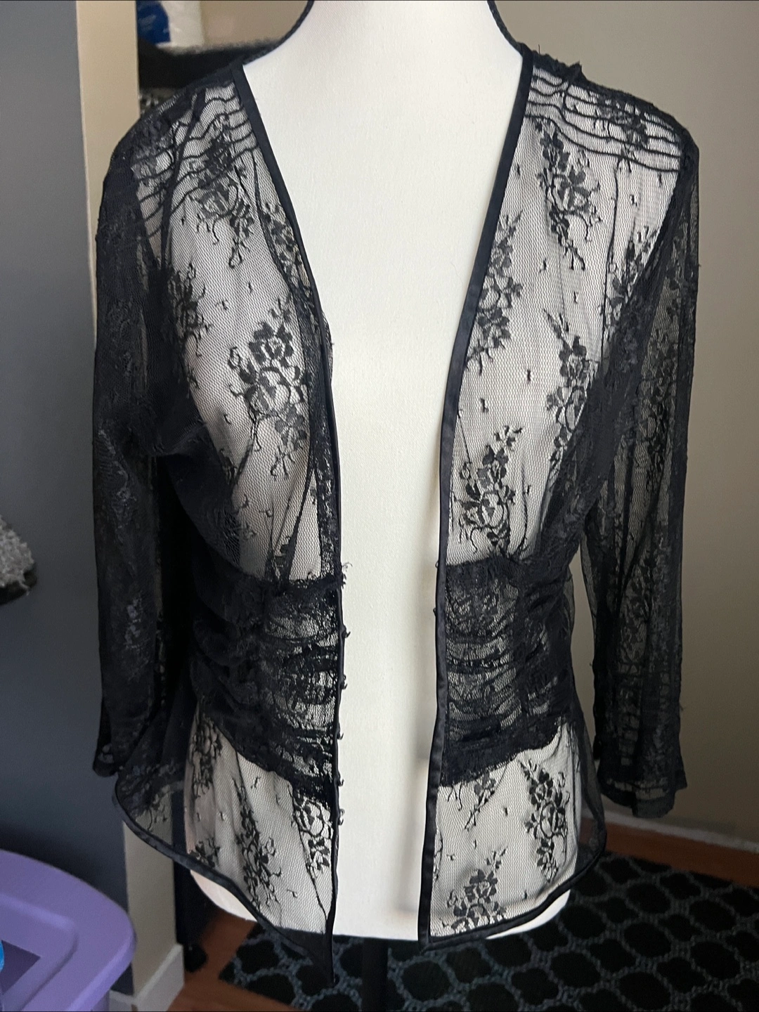 Beautiful black lace bolero. Three-quarter sleeves. Open front. Floral pattern. Lightweight and sheer. Fits size M