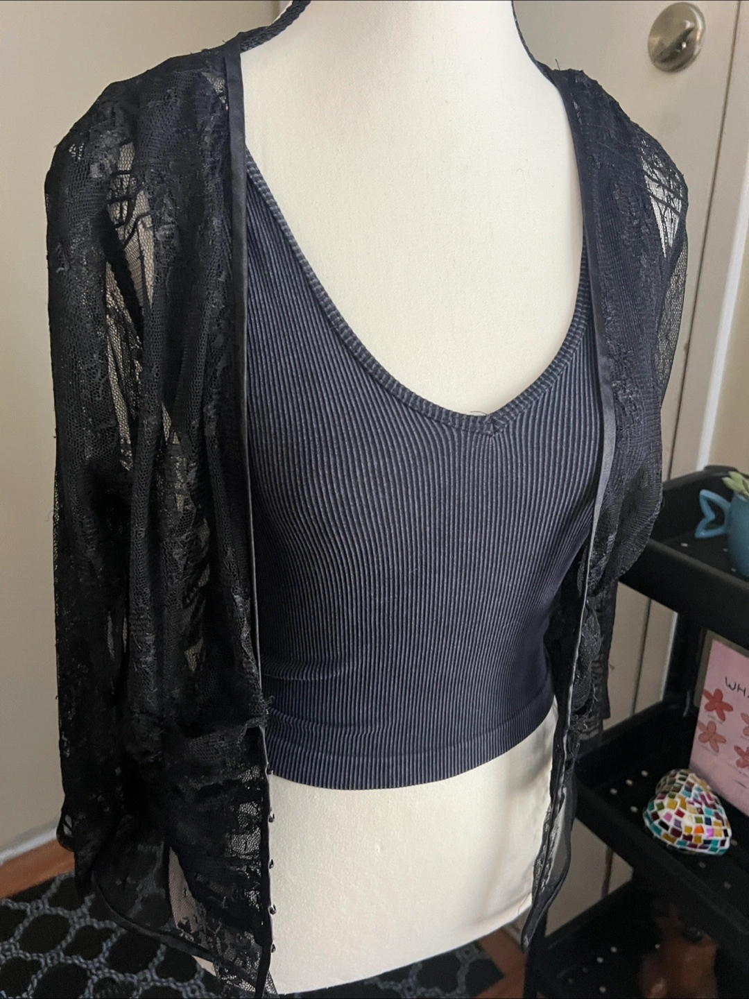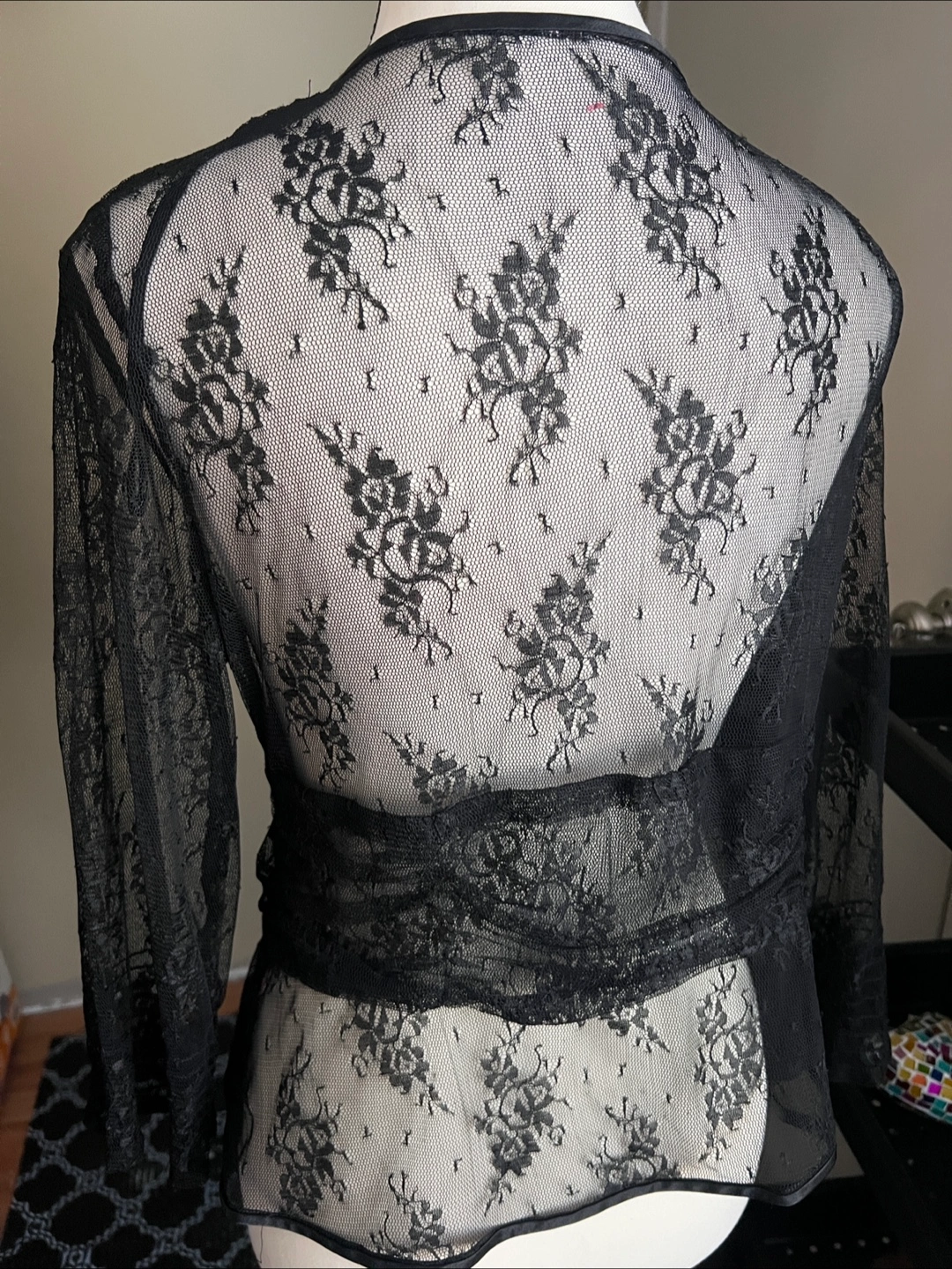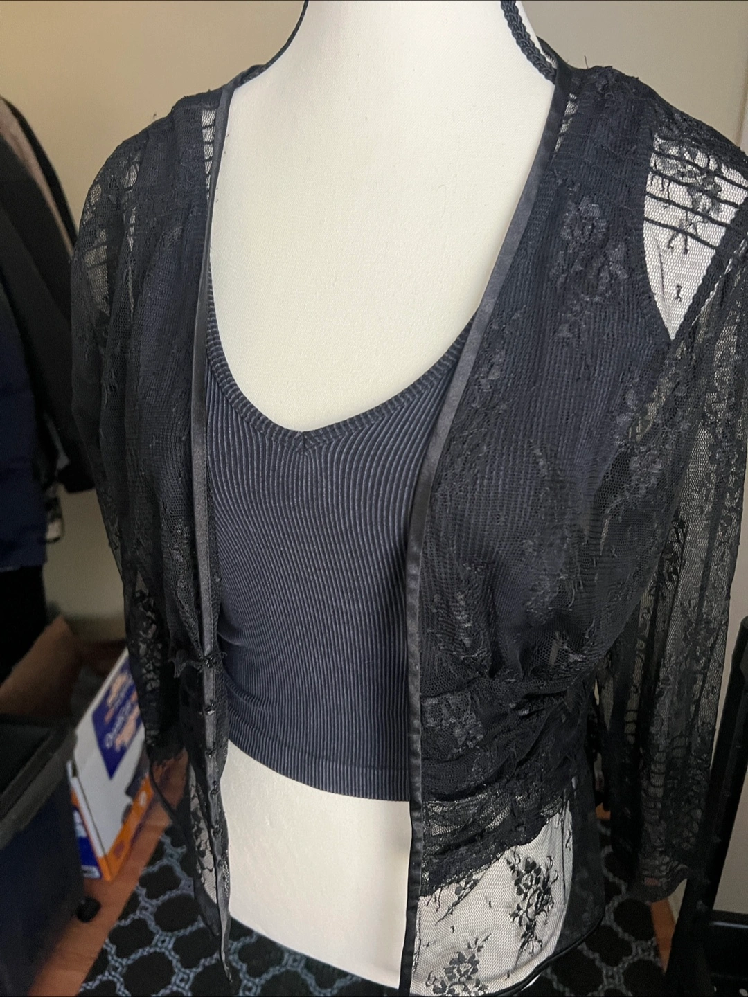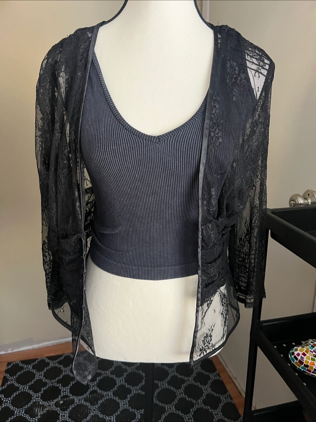 Beautiful black lace bolero. Three-quarter sleeves. Open front. Floral pattern. Lightweight and sheer. Fits size M
