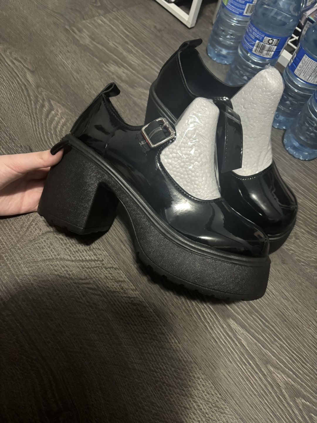 Super cute and coquette black chunky heels. They are good for walking as well because the chunky heel makes it comfortable :) so so cute but sadly itโs too small for me so Iโm letting someone else love these shoes. I reordered one for myself too bc look how lovely ๐๐