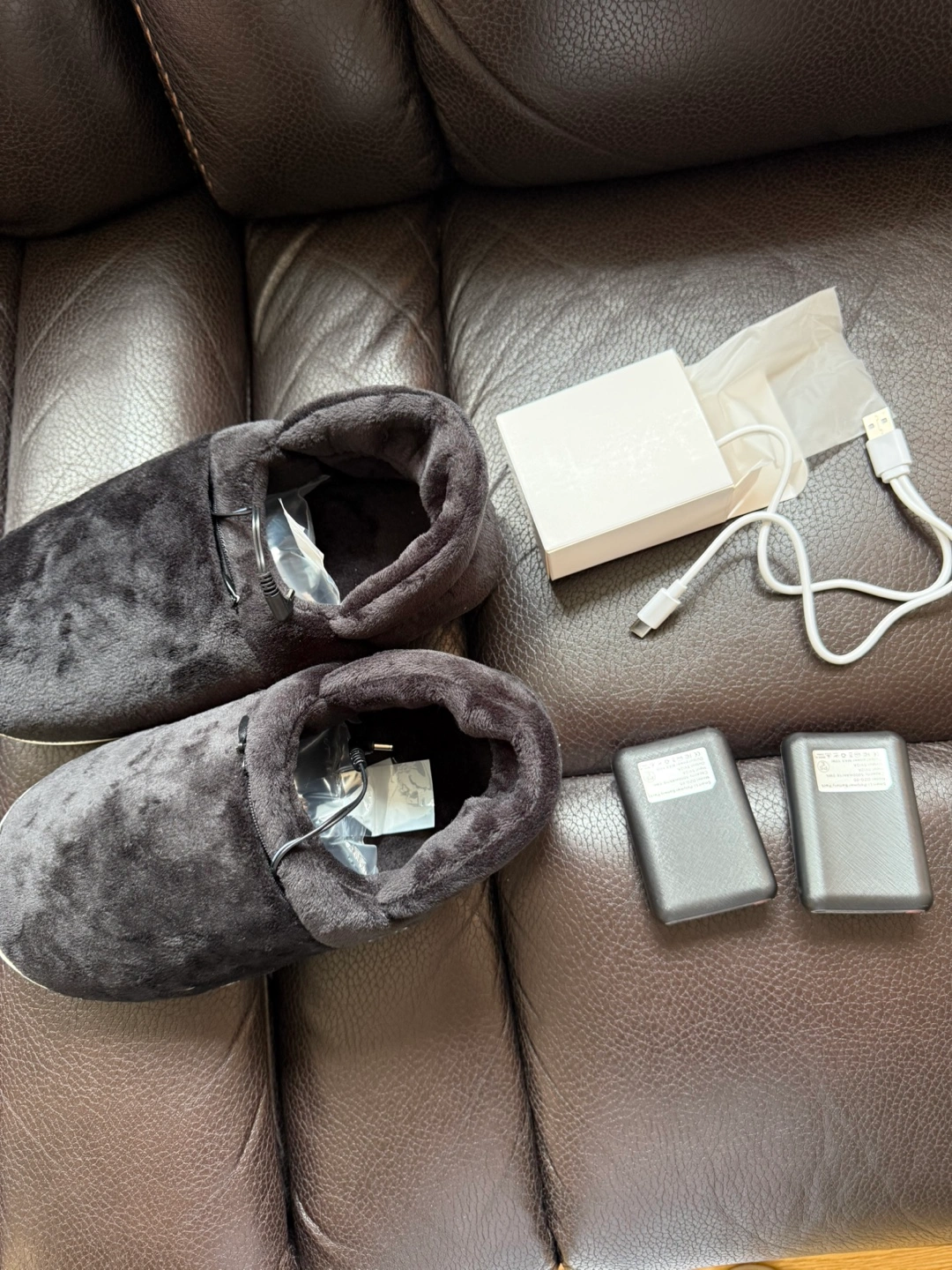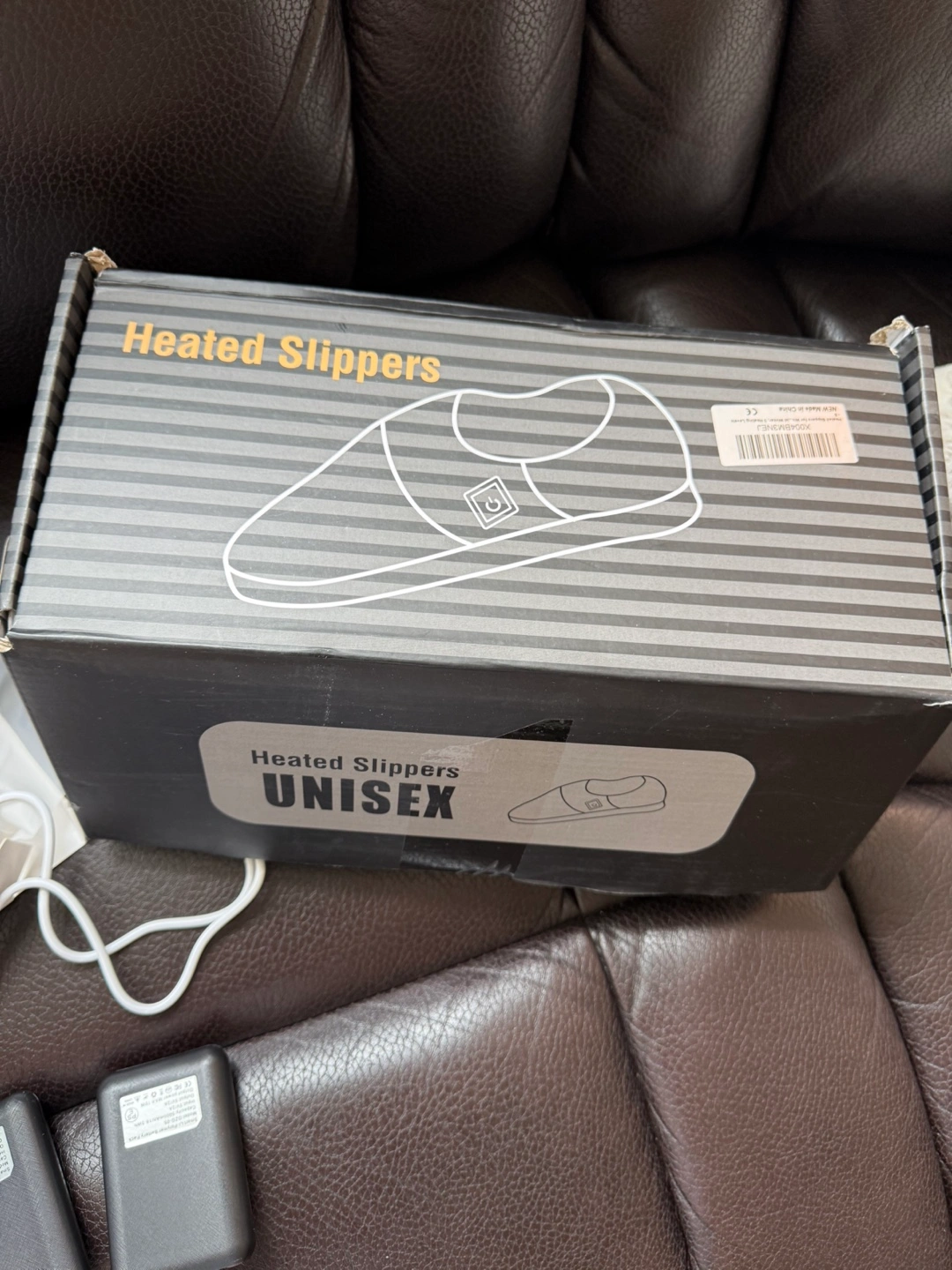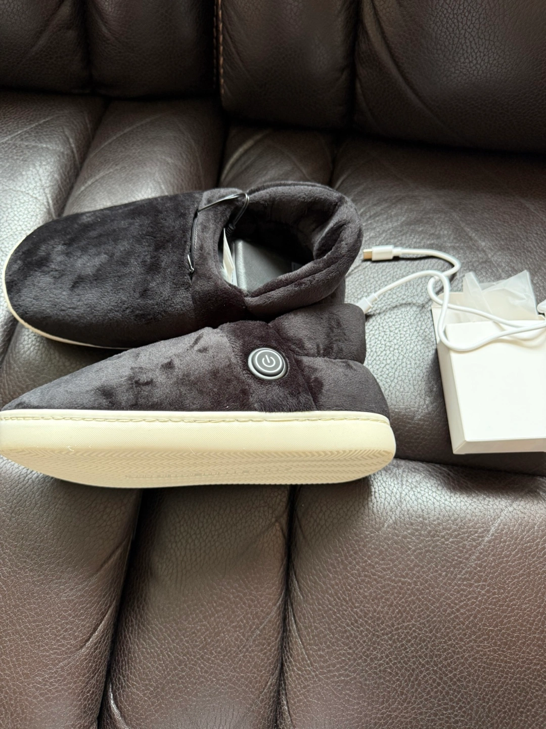 462Unisex heated slippers. Black, soft velvet fabric. Three temperature settings. Includes rechargeable battery packs and USB charging cable. Cozy and warm for cold nights. Brand new with box. Got them as gift but did not fit. Size 38-39 or 7.5-8. Fully charged and ready to go.