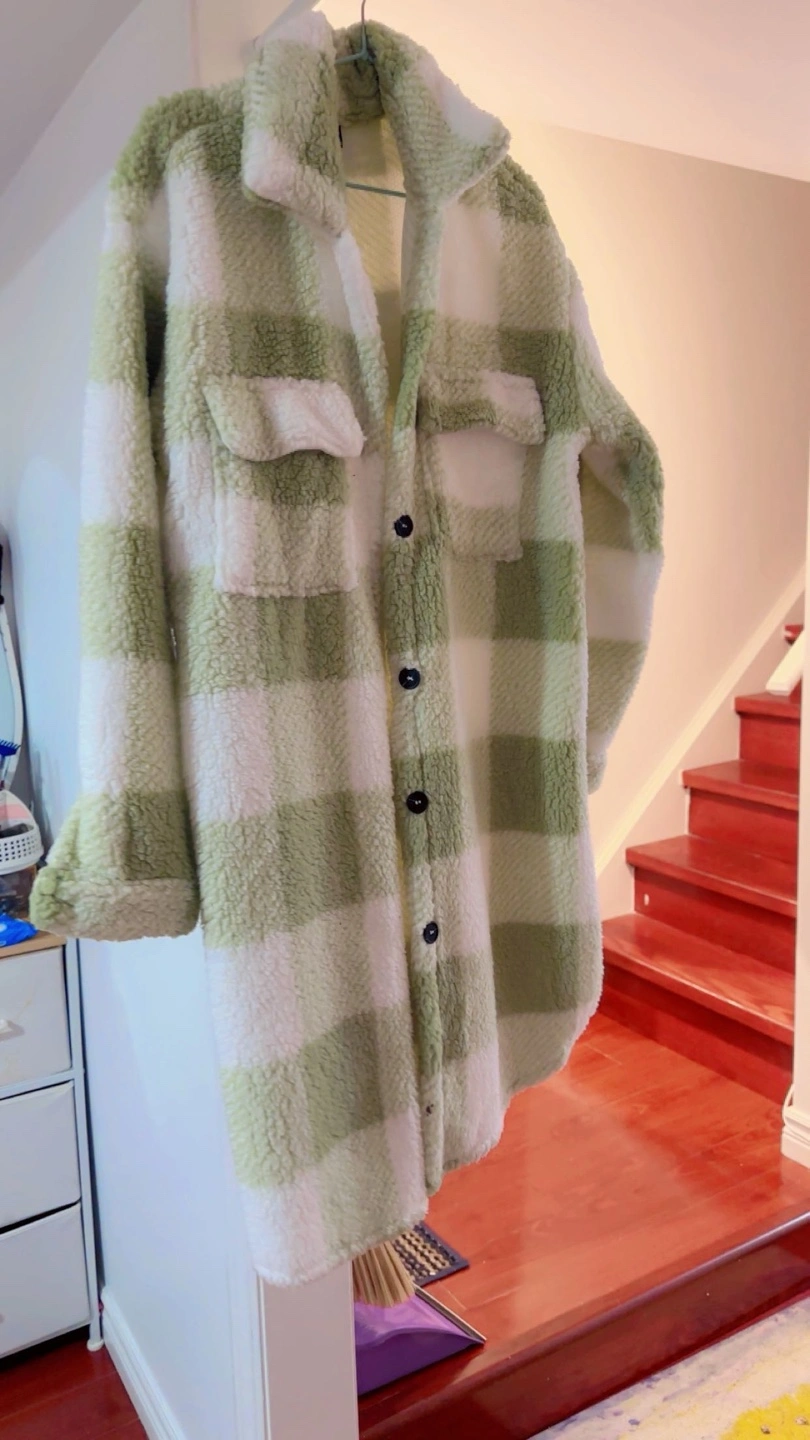 Long-sleeved shirt jacket. Soft sherpa material. Button closure. Checkered pattern. Two chest pockets.