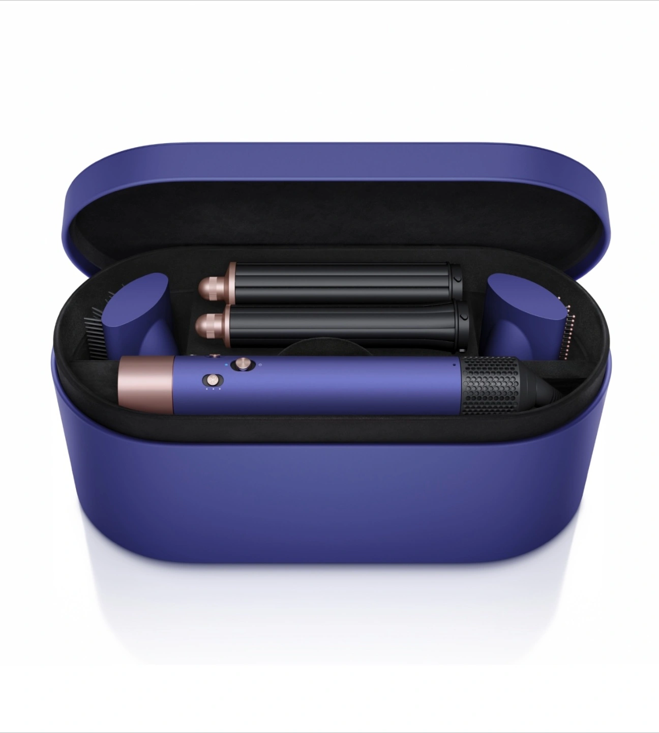 Dyson Airwrap styler. Includes multiple attachments: 30mm and 40mm barrels, firm smoothing brush, soft smoothing brush, and round volumizing brush. Complete set, comes in a purple carrying case