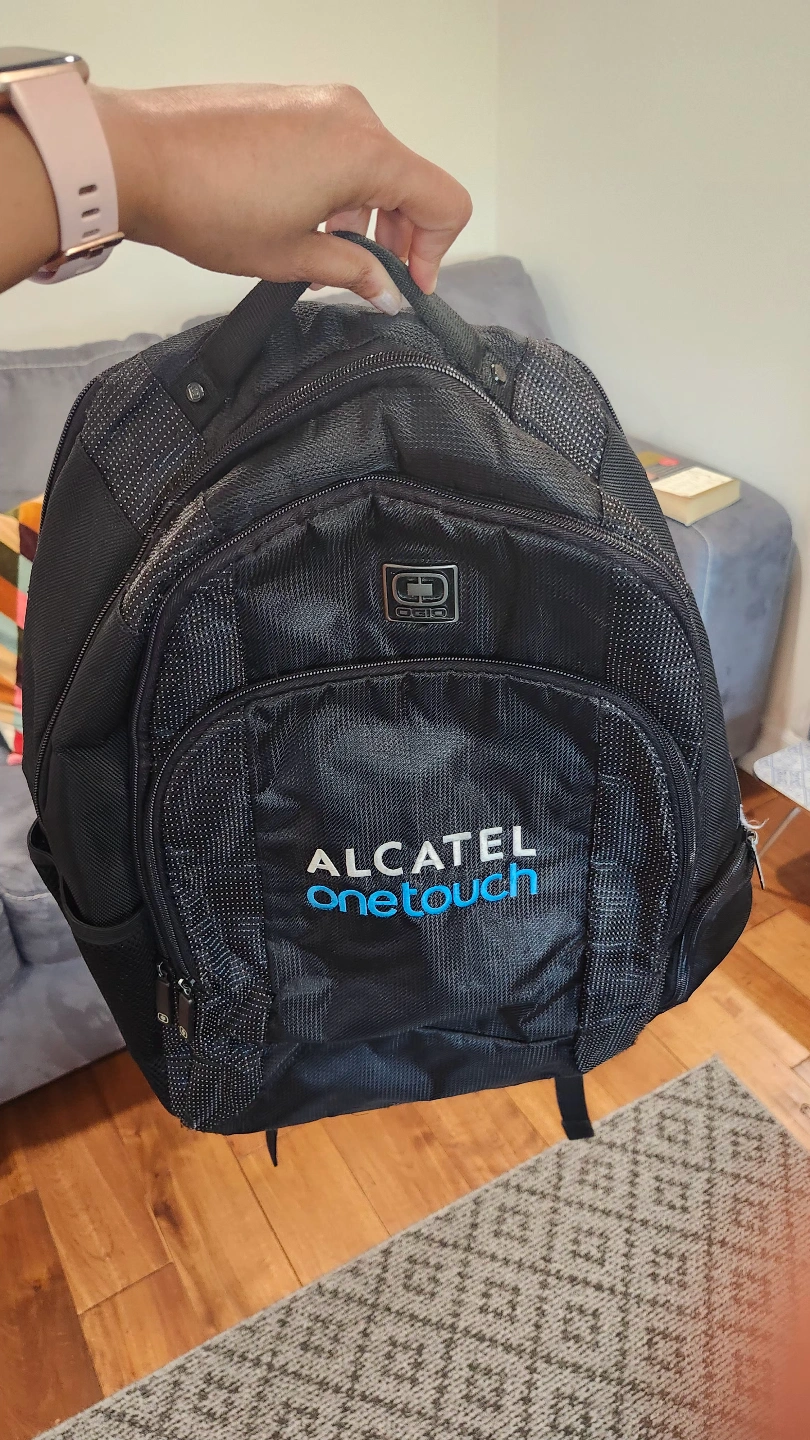 1000+Black backpack. Features multiple compartments and adjustable straps. Alcatel OneTouch branding. Good for everyday use or travel. perfect for laptop plus loads of stuff to carry whether to office or travel. sturdy , no wear n tear. light weight .