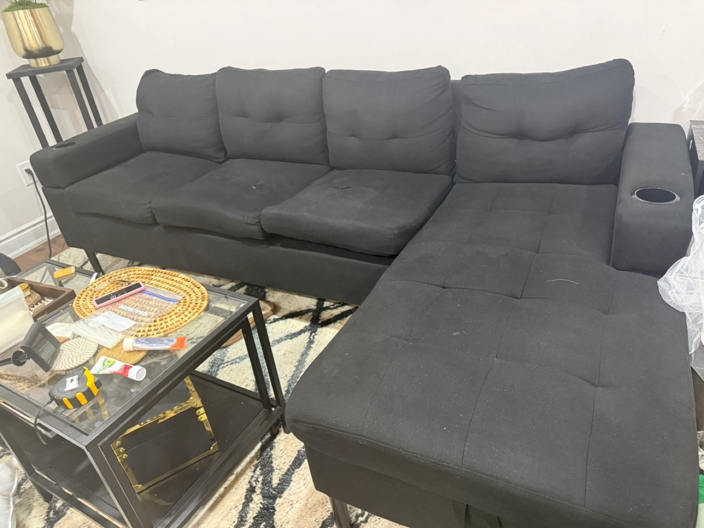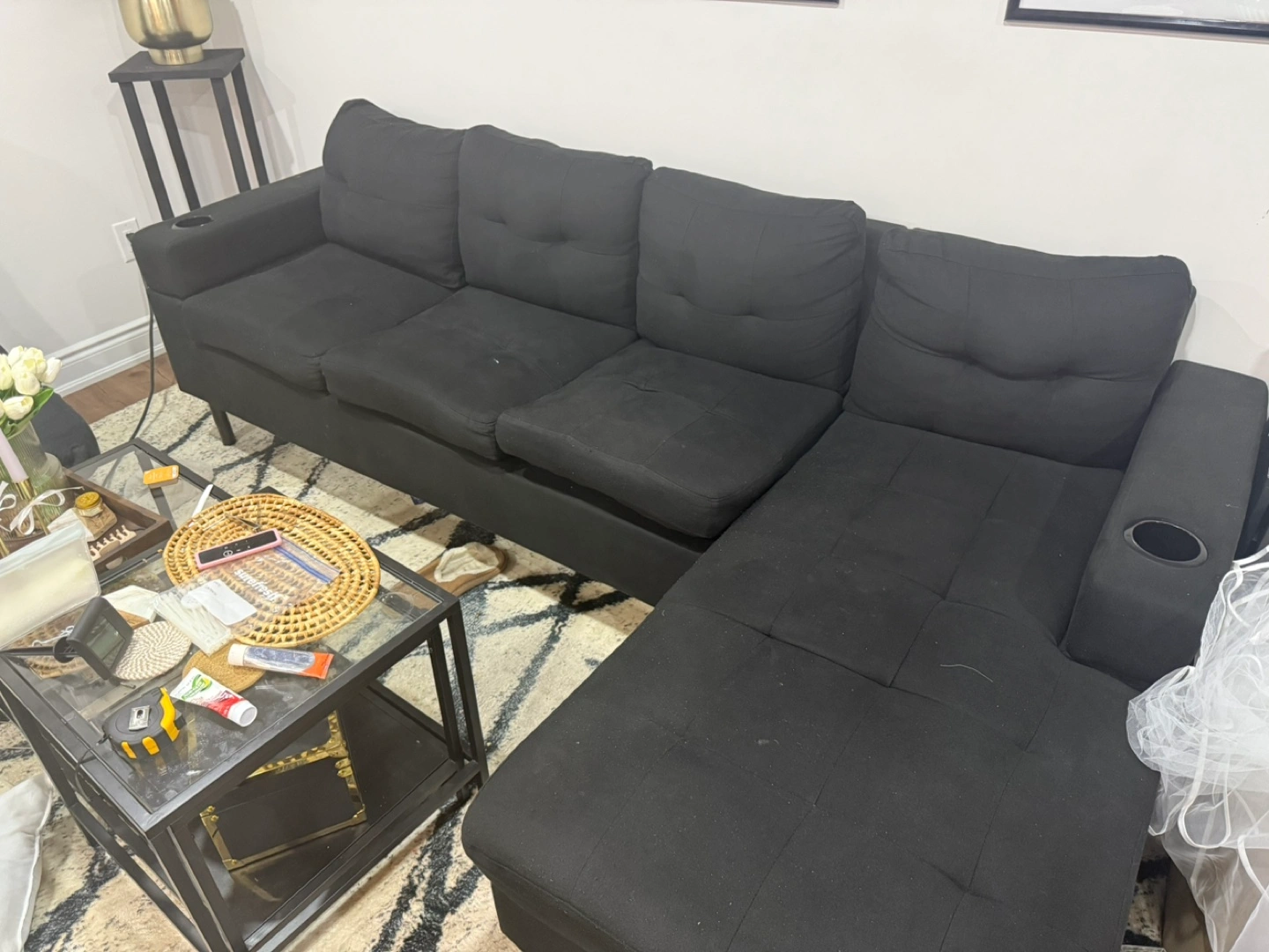 Comfortable black fabric sectional sofa. Features cup holders. Used condition. Good for smaller spaces.