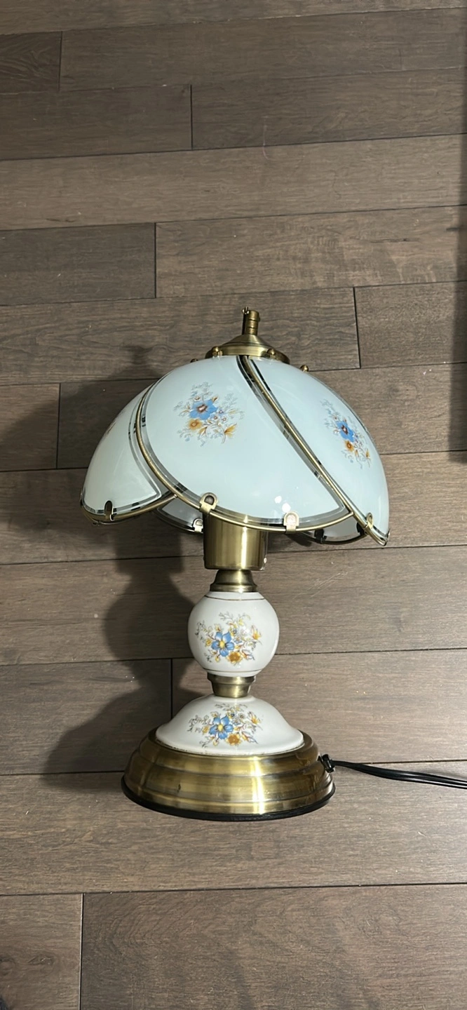 Beautiful vintage table lamp. Features a floral design on a white ceramic base and a frosted glass shade. Brass coloured accents. Great for bedside table or end table.