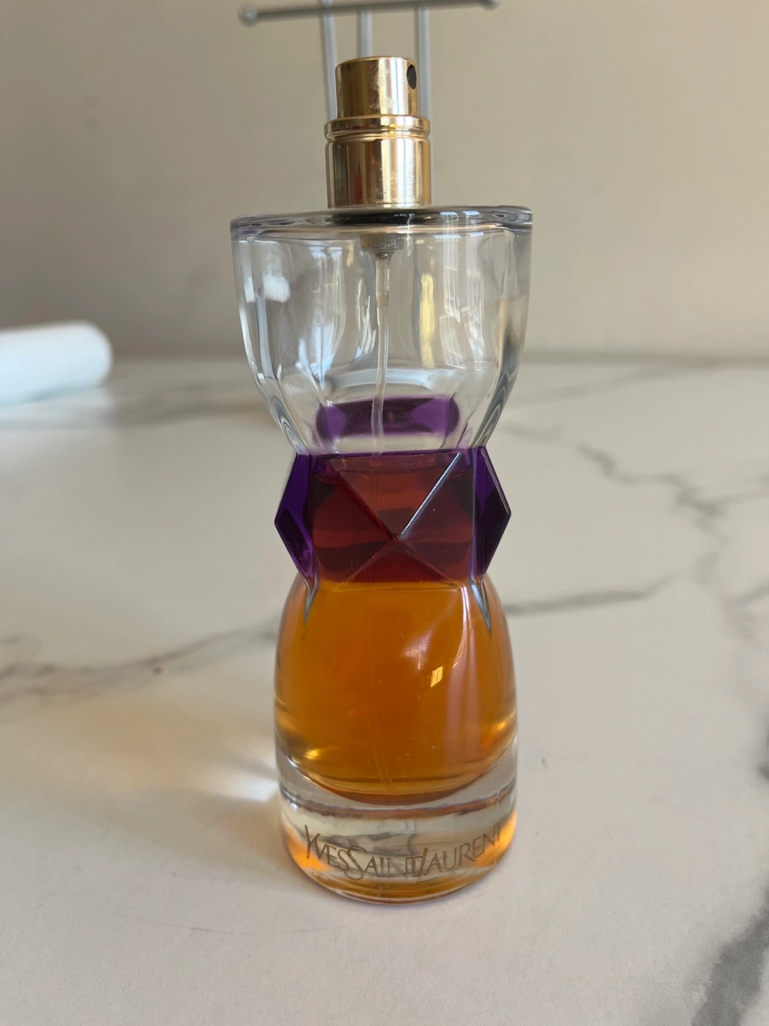 Pre-owned Yves Saint Laurent perfume. Unique hourglass-shaped bottle. Partially full. Don’t know the model of this perfume, missing lid