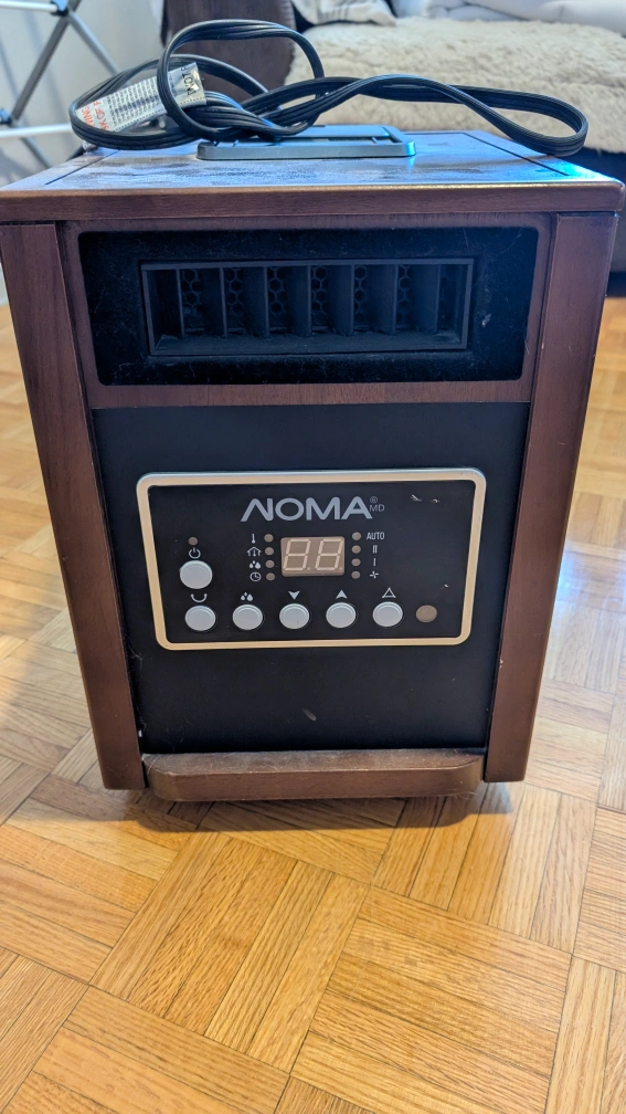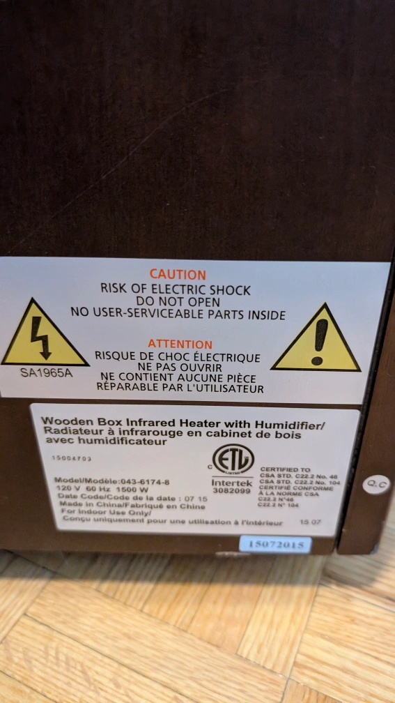 Wooden box infrared heater with humidifier. Digital controls. Model 043-6174-8. 120 V 60 Hz 1500 W. works great.