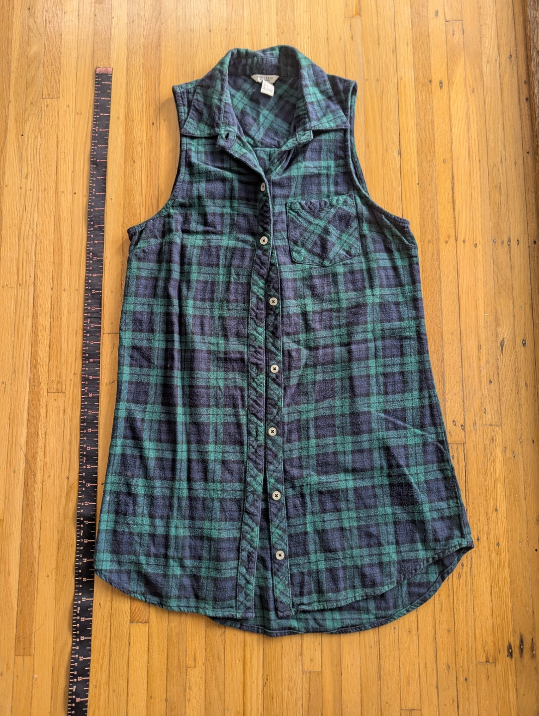Women's sleeveless shirt. Green plaid pattern. Button down front. Small size. Looks great with leggings or tights.