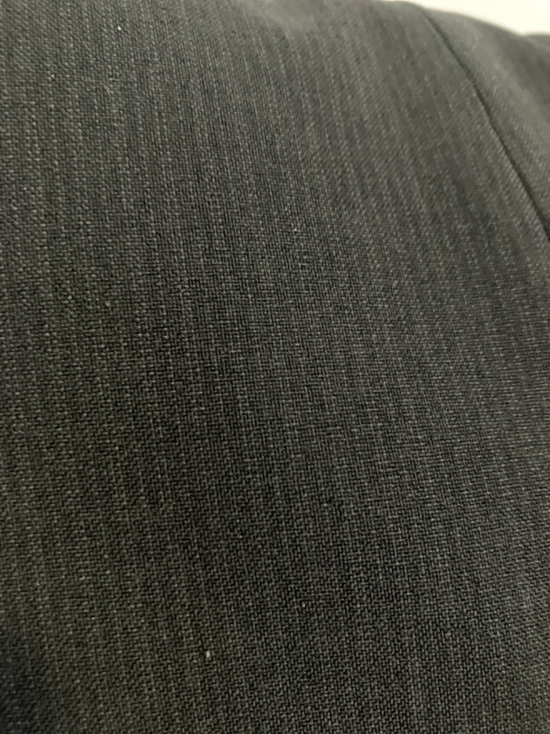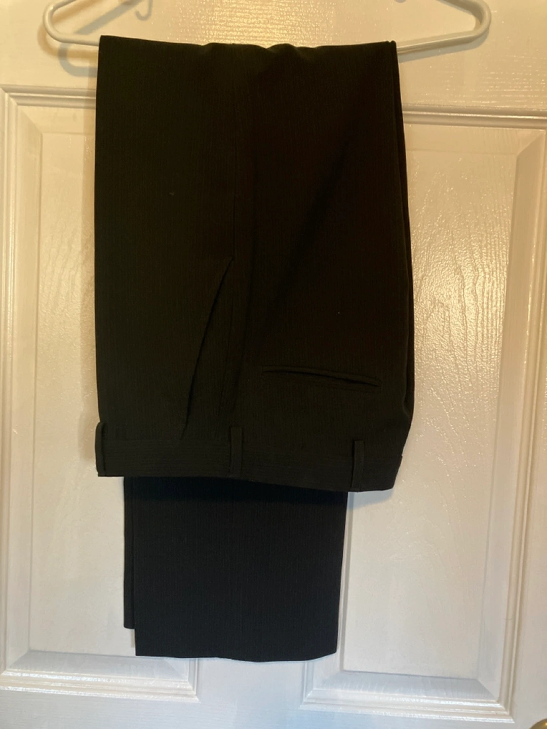 Flat front dress pants. Dark grey with subtle pinstripes. Classic style, great for work or special occasions. Good condition.