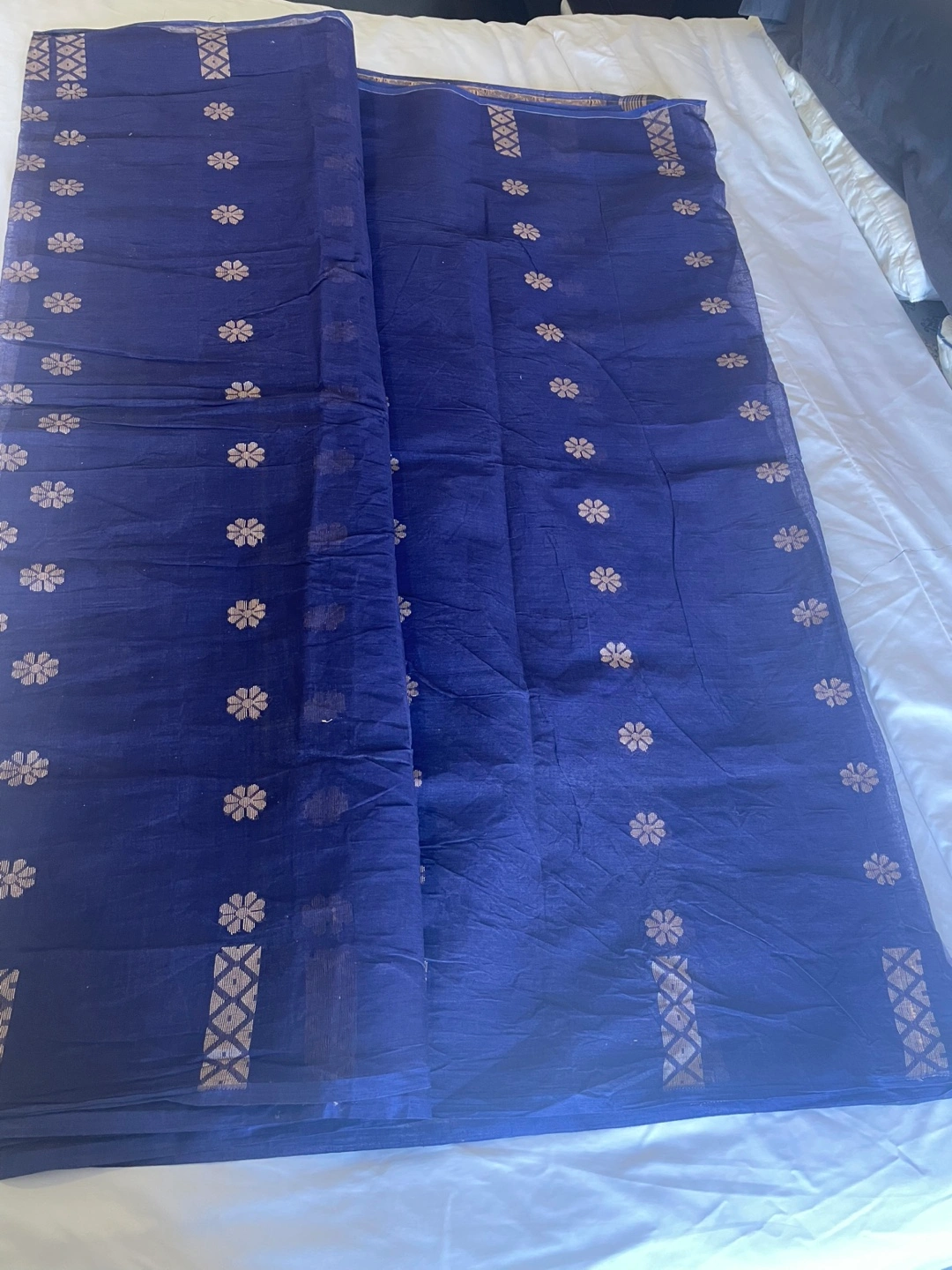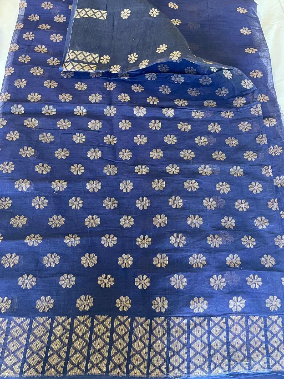 Elegant cotton taant saree. Features a deep blue colour with gold floral detailing.