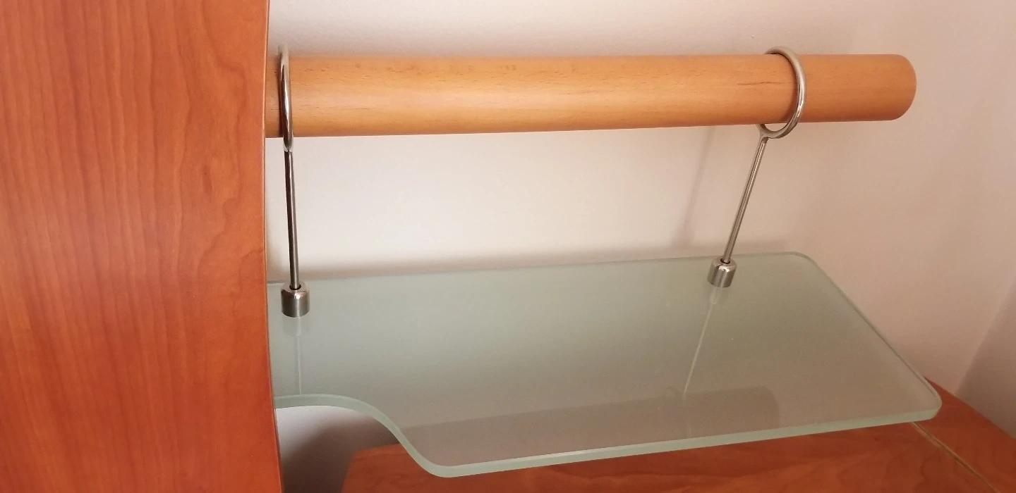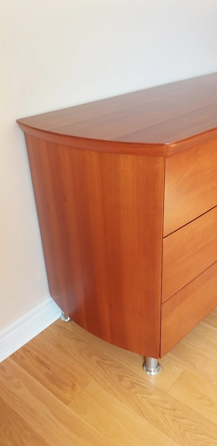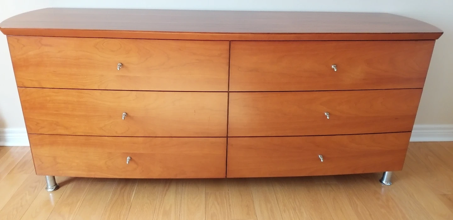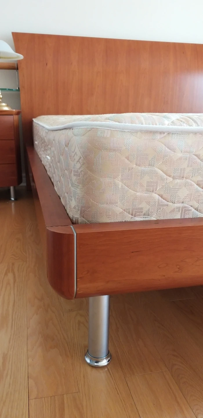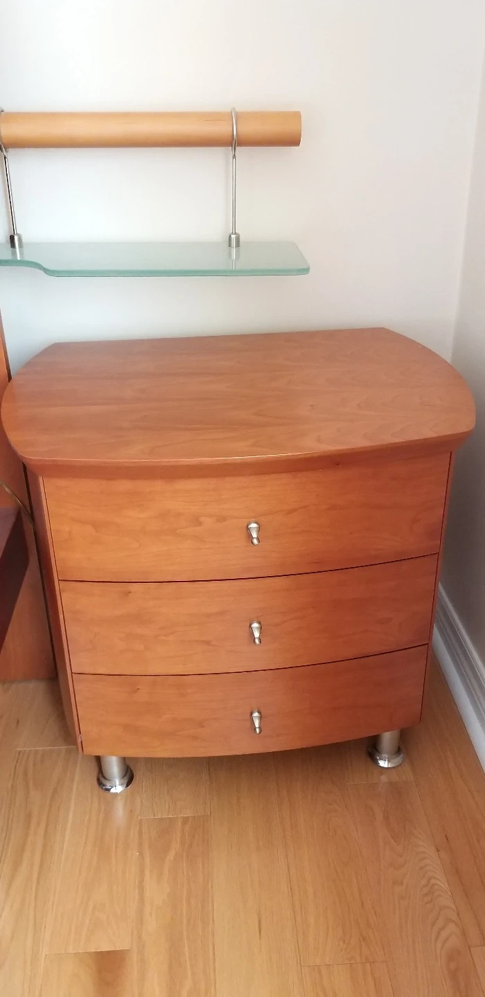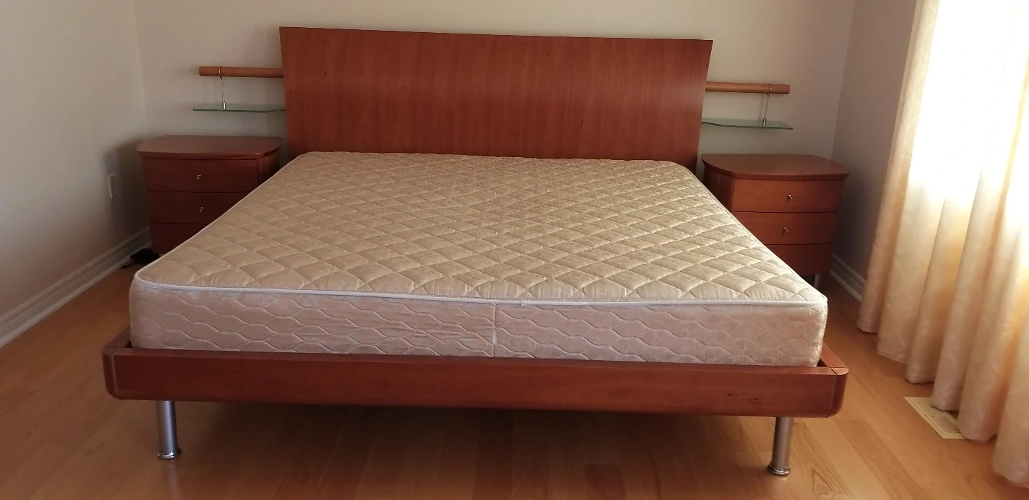 Modern King size bedroom set. Includes bed frame, headboard, and two matching nightstands. Wood frame with chrome legs. Headboard features integrated glass shelves and a wooden bar. Excellent condition, minimal wear.