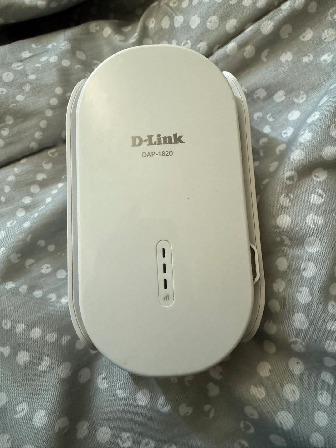 758Used D-Link DAP-1820 AC750 WiFi range extender. White plastic casing. Compact design. Good for boosting WiFi signal in your home or office. Good condition.