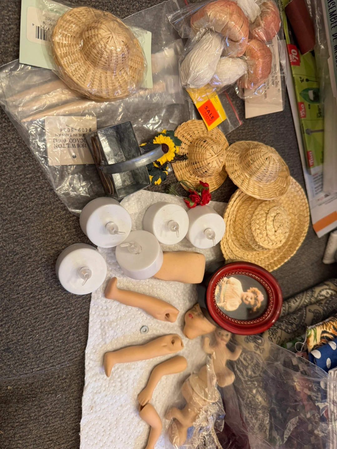 Large lot of craft supplies. Includes Paper Shapers scissors, stencils, assorted fabrics, miniature doll parts, miniature hats, artificial flowers, sequins, and more. Perfect for scrapbooking, doll making, or other crafting projects.