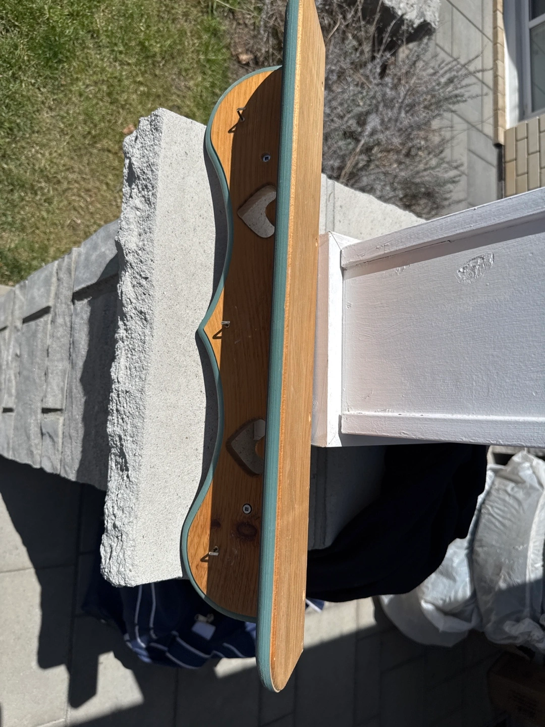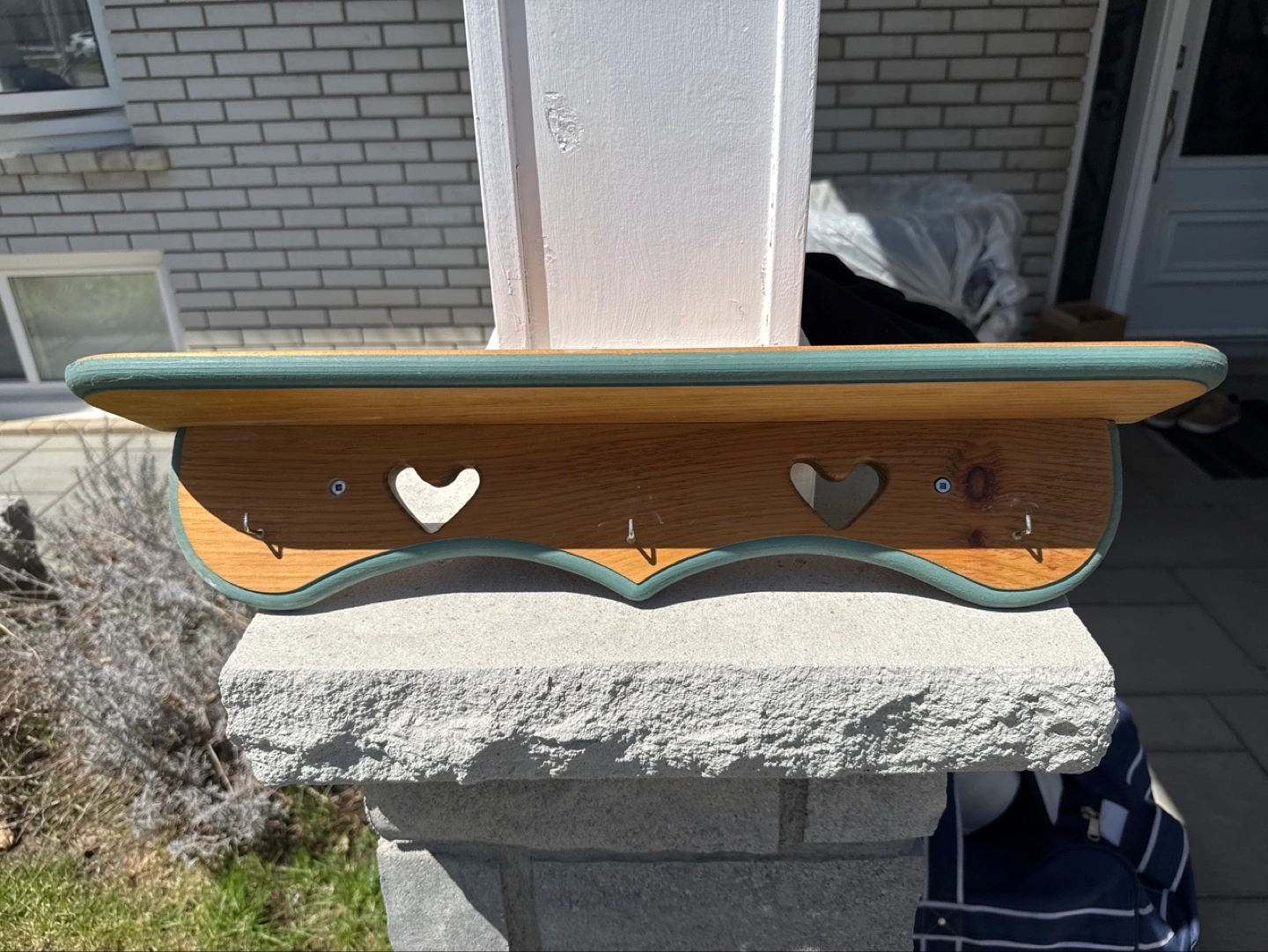 Charming wooden key holder shelf. Features three hooks and decorative heart cutouts. Painted edges. Adds rustic charm to any entryway. Mennonite made