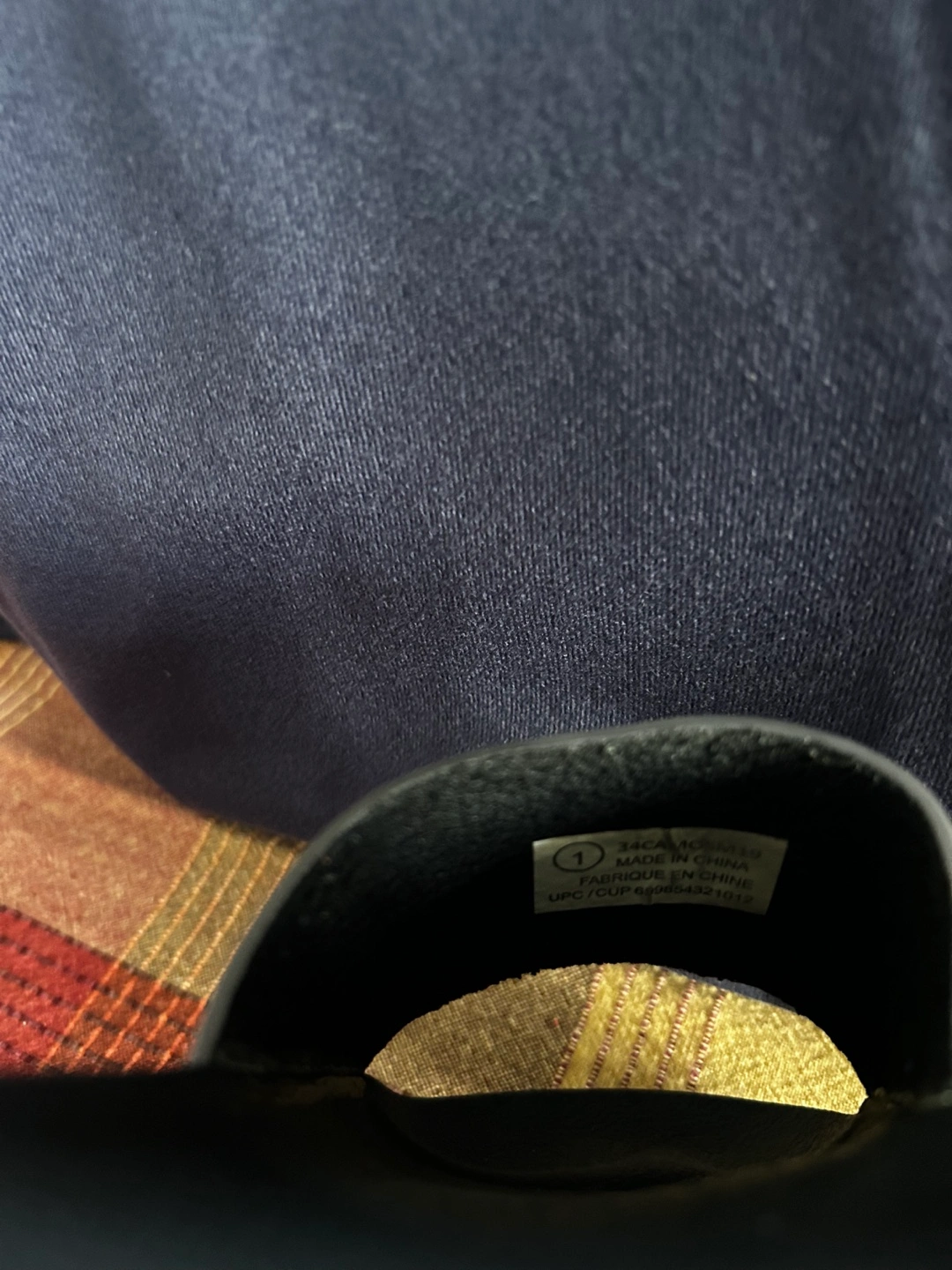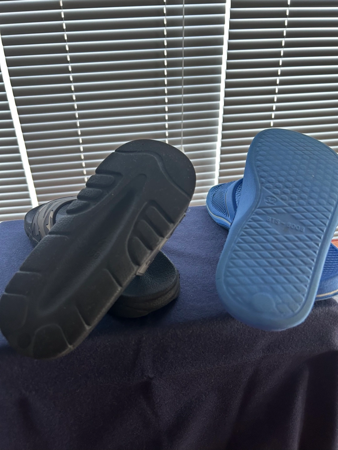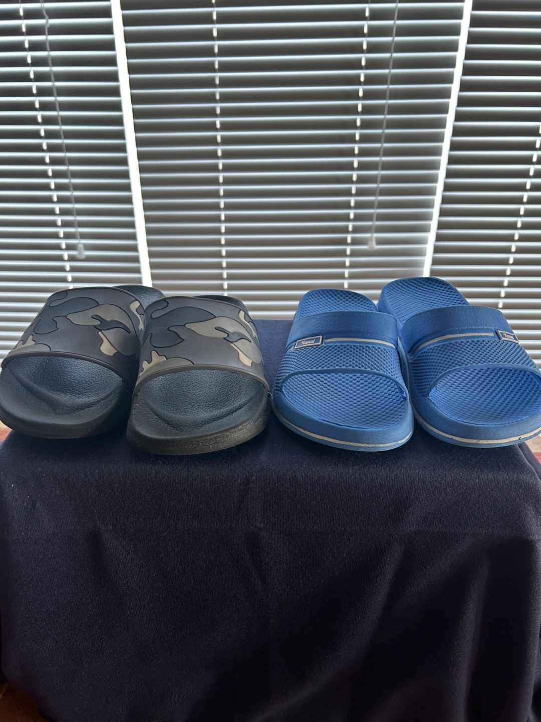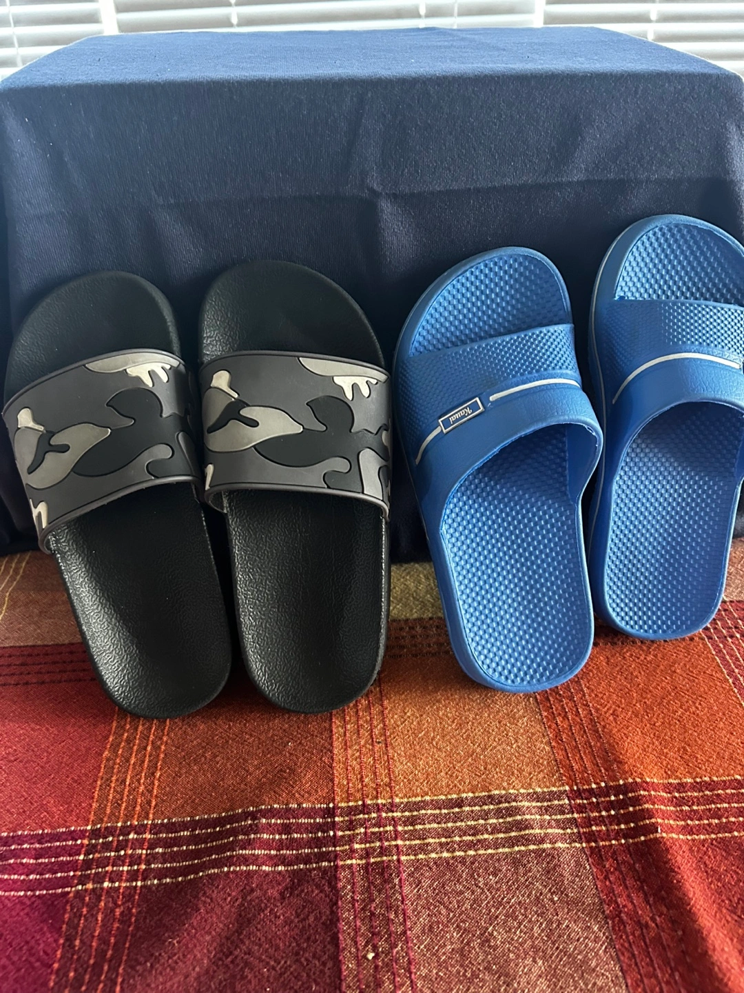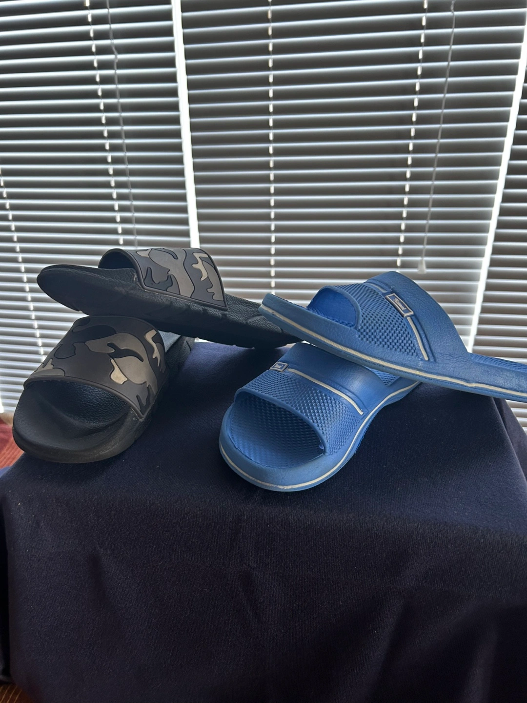 Two pairs of boy’s (size 1 / 32slides. One pair features a camouflage pattern, the other is solid blue. Both appear to be comfortable and lightweight. Good for summer.